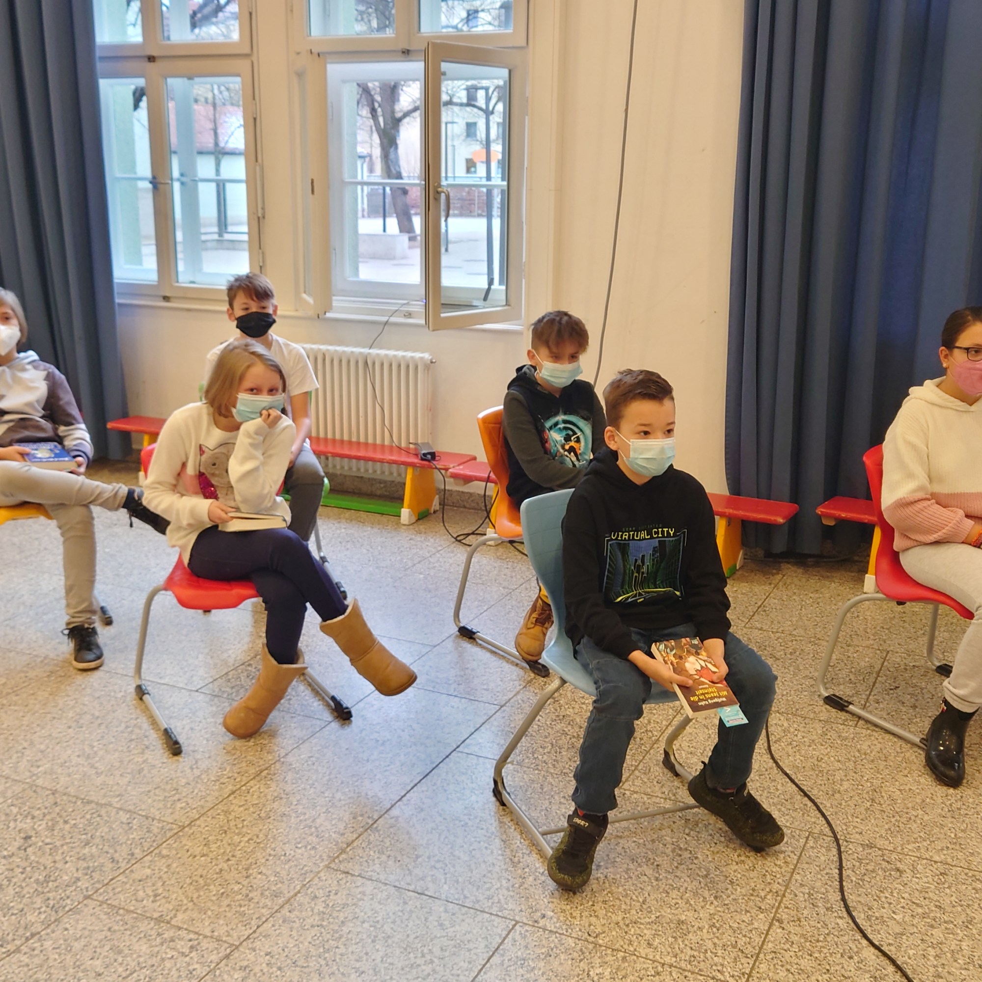 Zuerst hatten die Schülerinnen und Schüler die Gelegenheit aus ihren vorher vorbereiteten Büchern vorzulesen. Dann mussten sie aus einem ihnen unbekannten Buch, in dem Fall aus „Evie und die Macht der Tiere“ von Matt Haig lesen.