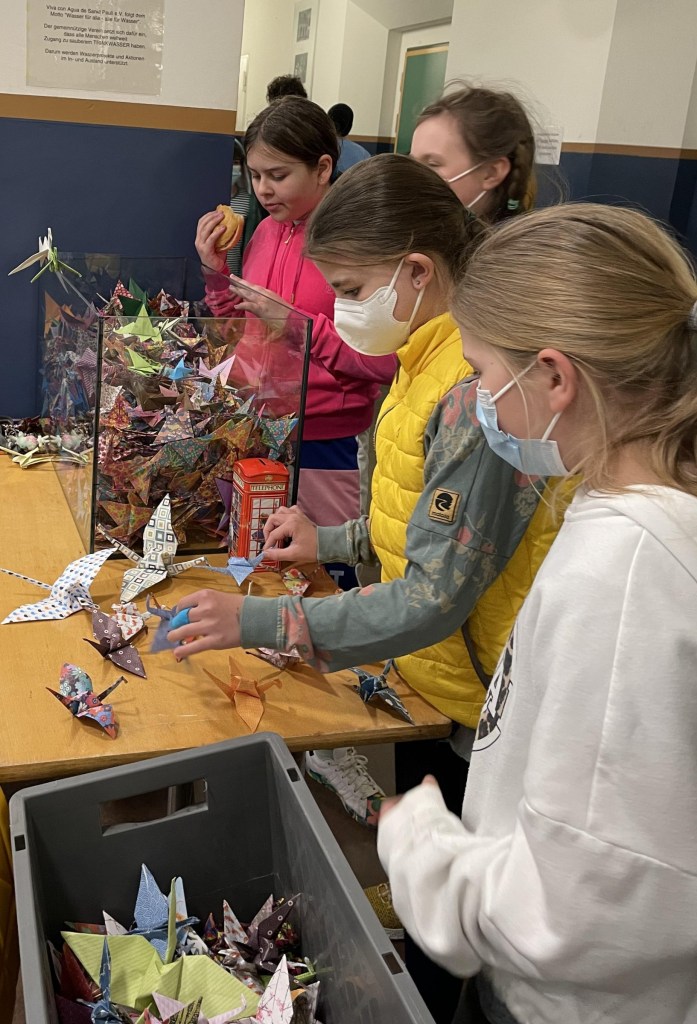 Viele Schülerinnen und Schüler sowie Lehrkräfte bastelten eifrig Kraniche, die nicht nur in Japan sondern auch weltweit ein Symbol des Friedens sind. Sie wurden in den letzten Wochen einzeln für einen geringen Betrag verkauft. Ziel war es, den Erlös zu spenden.