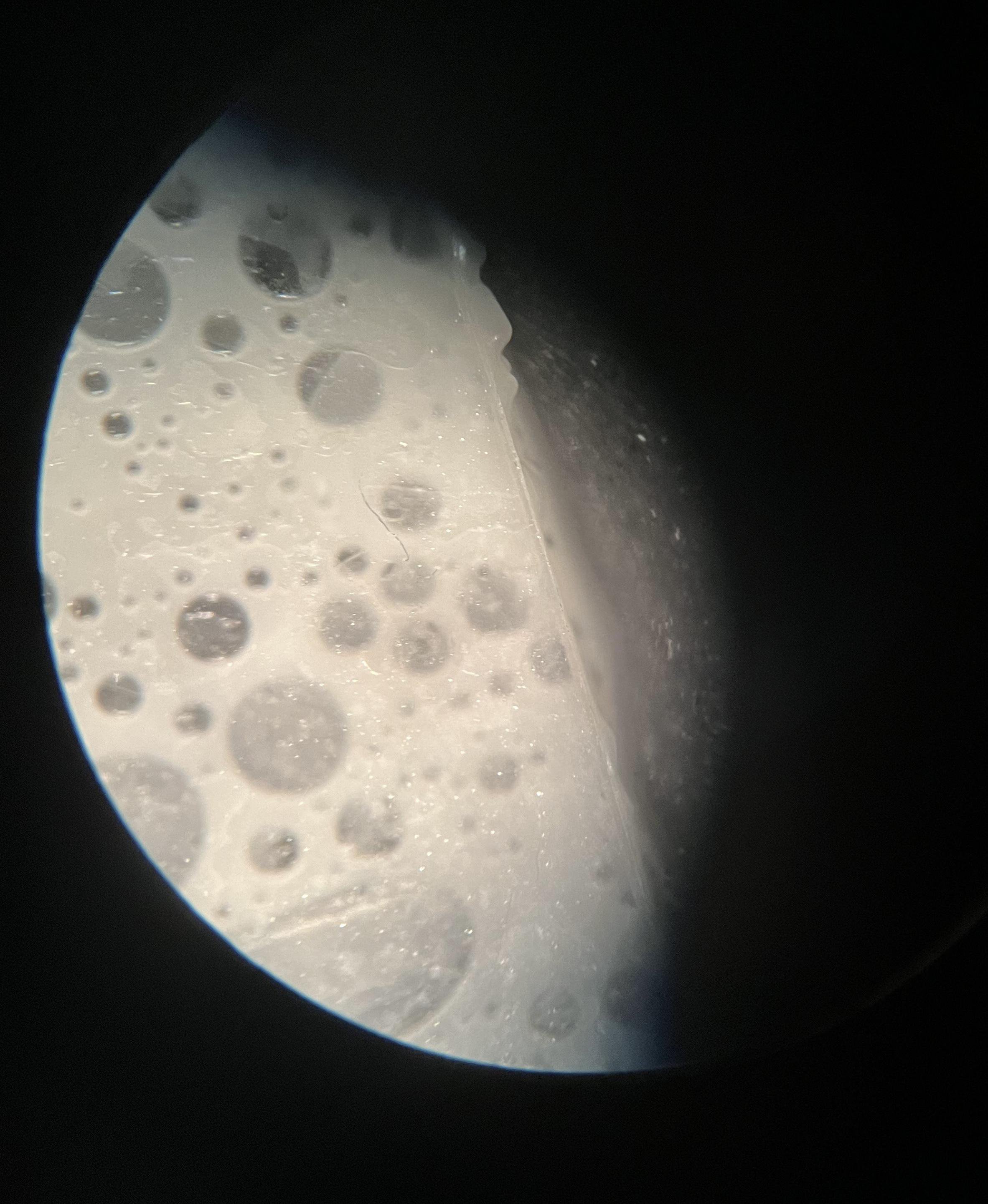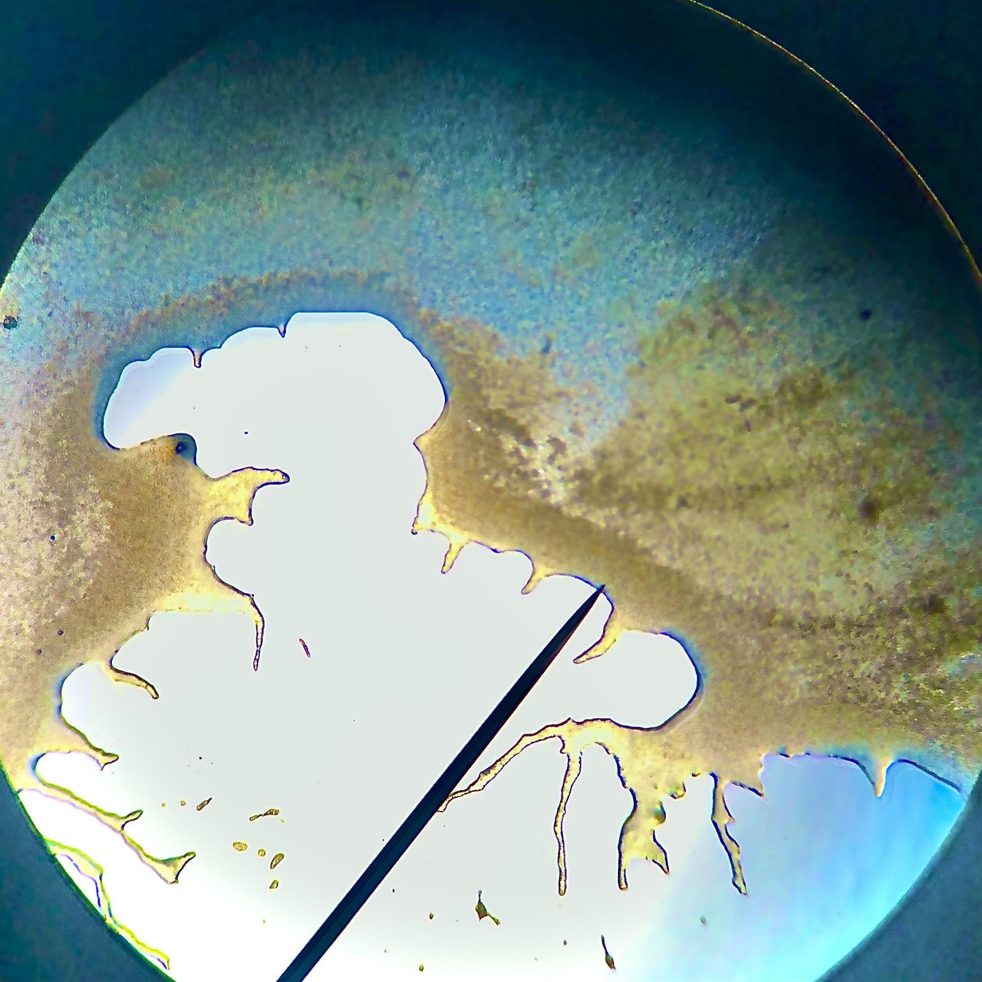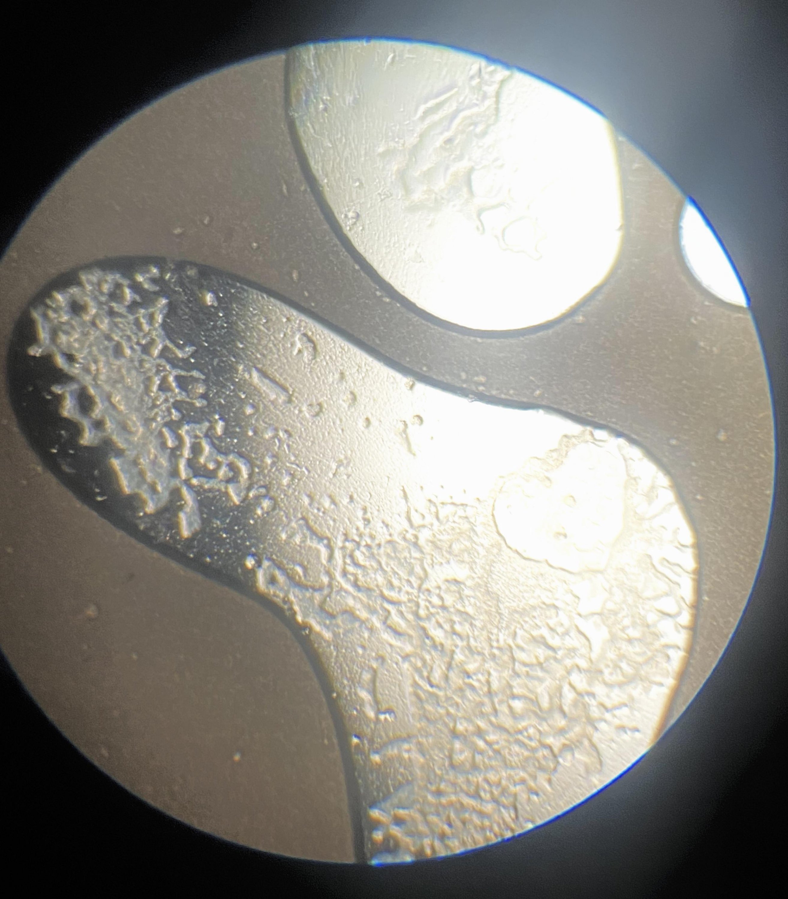 Die Präparate wurden teils mit Aufstecklinsen für Handy fotografiert. Dabei sind „Mikro- und Makrofotos“ entstanden, die ausschauen als wären es Aufnahmen von einem anderen lebensfeindlichen Planeten. Sehr selbst, ob ihr erkennt, was hier unter dem Mikroskop lag.