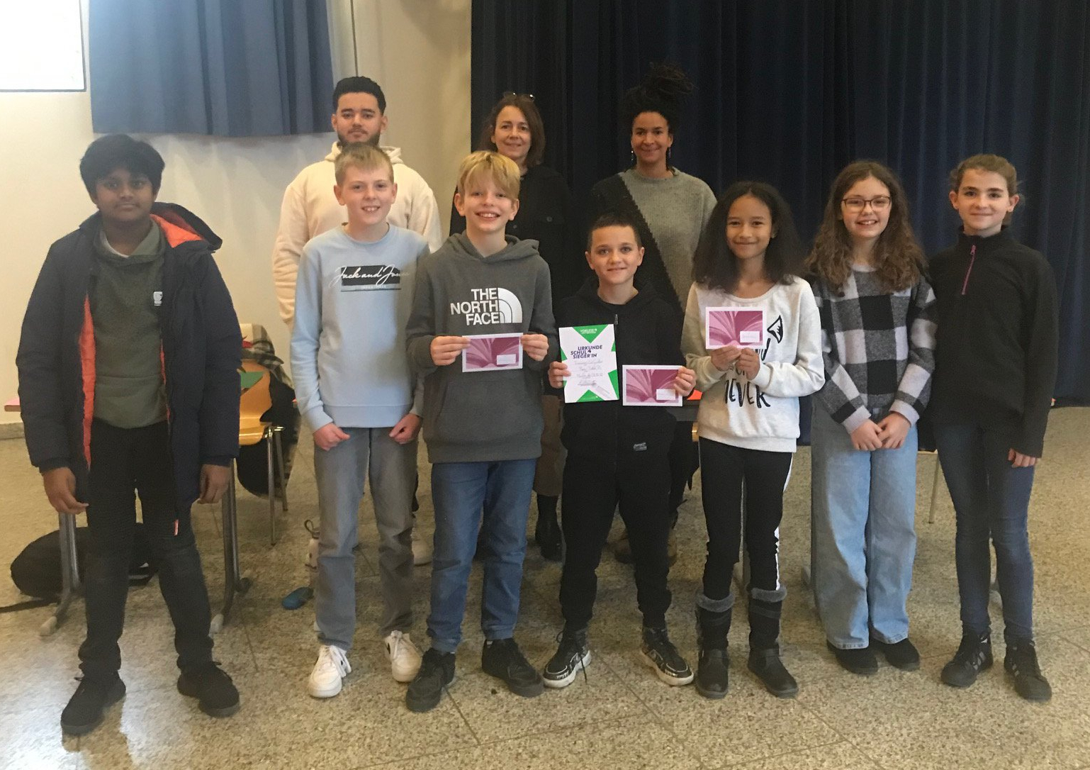 Dabei traten die Klassensieger aus der 6a (Ariane Kath, Jennifer Königseder), der 6b (Enrico Ruppert, Gareth Wähler), der 6c (Aswin Suthakaran, Anna Wolz) und dem Förderunterricht Deutsch (Francesco Lo Giudice) um den Platz als Schulsieger an. Sie wurden begleitet von jeweils zwei Freundinnen*, die ihnen fest die Daumen drückten und sie moralisch unterstützten.