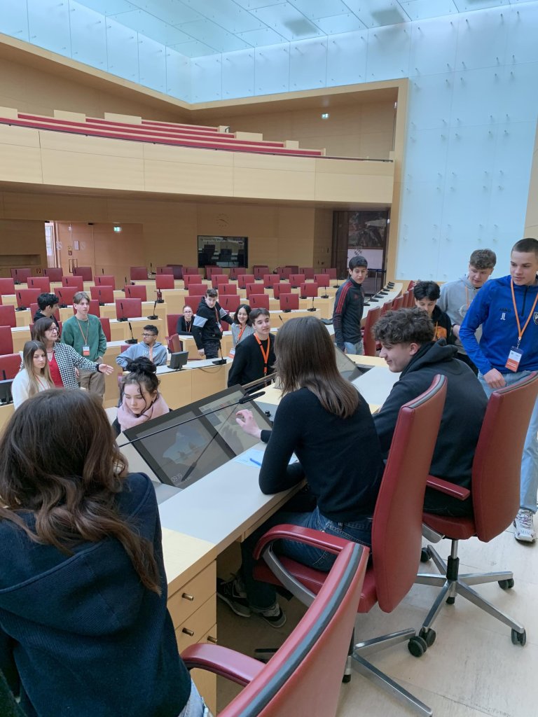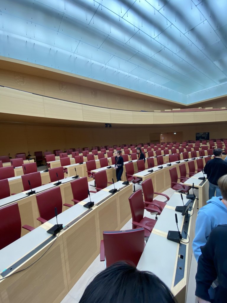 Auf dem Programm standen die Vorstellung der Geschichte des Maximilianeums und der Einblick in Organisation sowie die Aufgaben des Landtages. Dabei besuchten die Schülerinnen und Schüler den Plenarsaal und durften sich zum Abschluss auch auf die verschiedenen Plätze einzelner Abgeordneter setzen.
