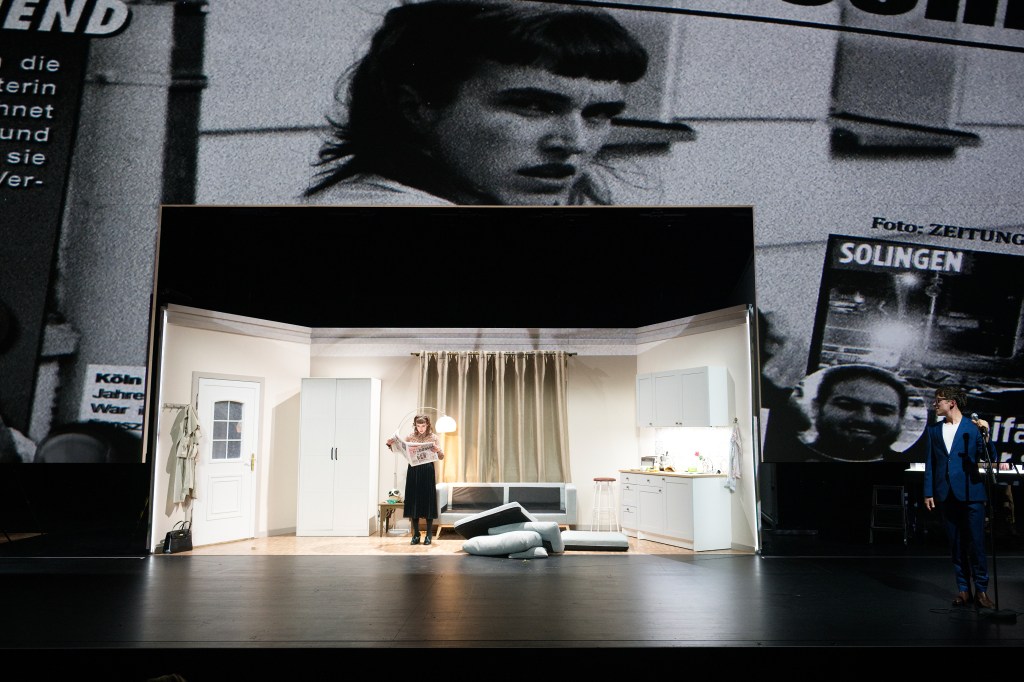 Das zweite Stück, „Alles ist aus, aber wir haben ja uns“ von Stefanie Sargnagel und Michael Fehr erhielt von uns am 15. Februar mit seiner farbenprächtigen Inszenierungsankündigung an Bühnenbild und Kostümen Vorschusslorbeeren, die sich nicht erfüllten. Ging es in der Unterwasserwelt um die in Gefahr geratene Meereswelt oder um Beziehungskonflikte zwischen Mann und Frau oder die Frage nach Geschlechteridentitäten? Ganz verstanden haben wir das nicht.