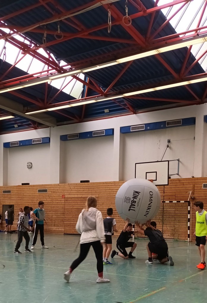 „Blue, grey oder noir!“ – Welche Mannschaft muss den riesigen Kinball mit vier Spielern auffangen, bevor er zu Boden geht? Das war hier die Frage, die sich die aus Mädchen und Jungen bestehenden Teams schnell stellen mussten., um zu reagieren.