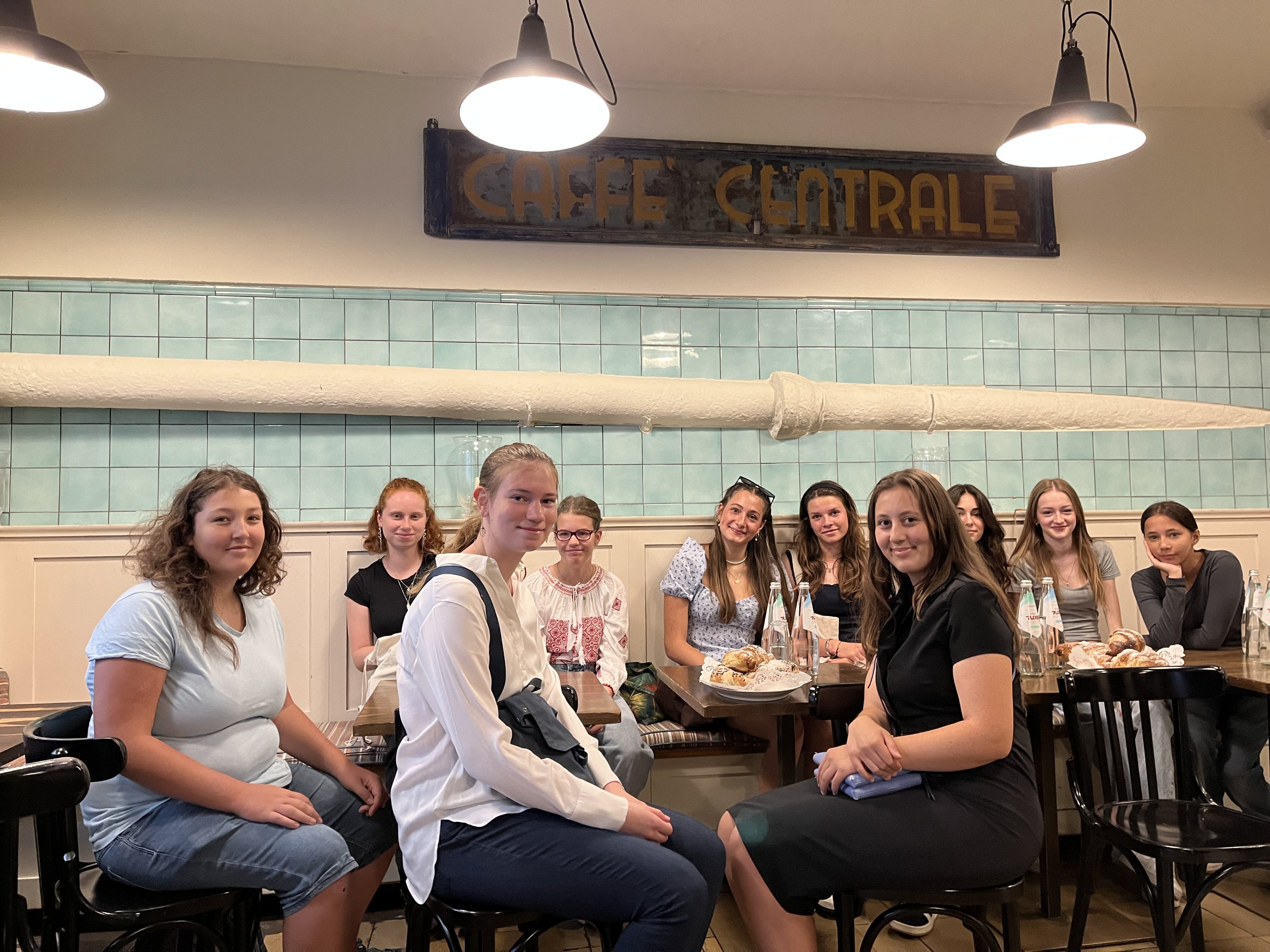 Der Personalleiter Maximilian Jakob erwartete uns in der alten Bäckerei der Bar Centrale. Nach einer herzlichen Begrüßung kam bereits die Frage, ob wir Lust auf ein kleines Frühstück haben. Dazu muss man uns nicht lange bitten. Mit ofenfrischen Cornetti, gefüllt mit Schoko, Vanille und Marille sowie frisch gepressten Orangensaft wurden wir verköstigt. Dabei stellte ein Schüler fest, O-Ton: „Das sind die besten Croissants, die ich je gegessen habe und ich war schon in Frankreich!“ Wobei man wissen muss, dass Cornetti das italienische Pendant zu französischen Croissants sind und sich sowohl im Teig unterscheiden als auch in der Füllung, die die Italiener lieben.