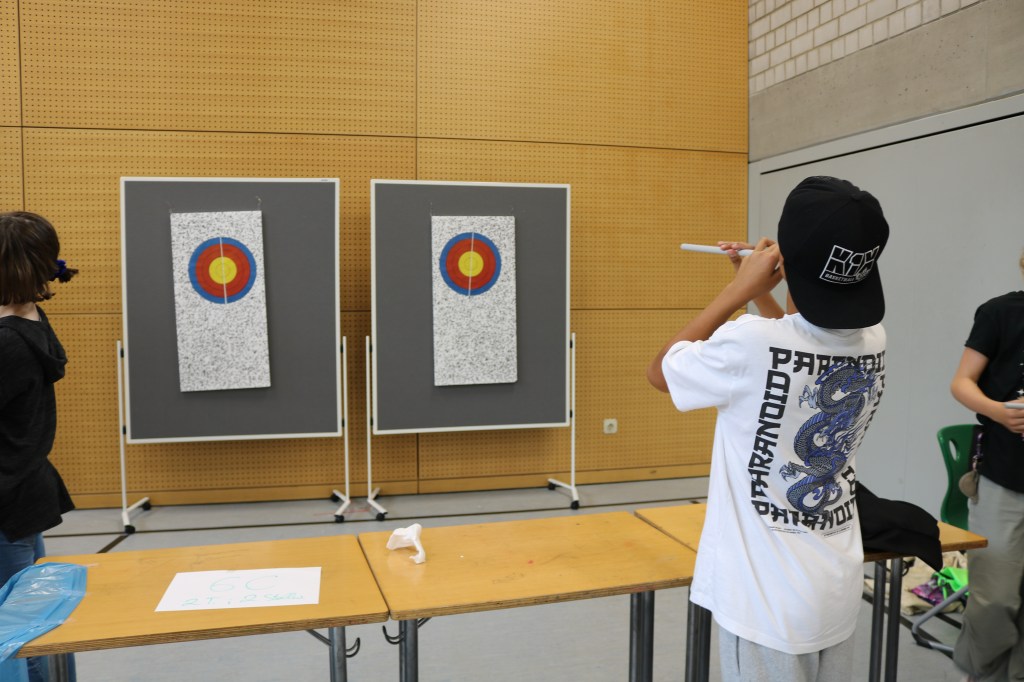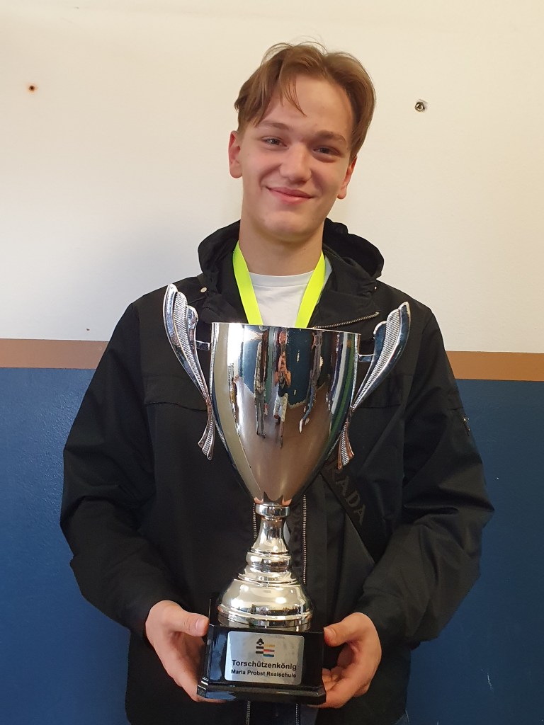 „Dreimal unten, dreimal oben!“, so lauten die Regeln beim erstmals durchgeführten Torwandschießen an der MPR im Rahmen des Sommerfestes. In einem spannenden und hochklassigen Finale legte Aysam (5c) zum wiederholten Male mit drei Treffern vor. Brendan (7a) übertraf diese schon sehr gute Leistung und schoss viermal durchs Loch. Den Schlusspunkt setzte aber der glänzend aufgelegte Marcel Perak (8d). Mit sagenhaften fünf Treffern ließ er seine Konkurrenten hinter sich und darf sich erster Torschützenkönig der MPR nennen. Marcel freute sich auf einen Wanderpokal, auf welchem sein eigener Name zu finden ist: „Das ist cool. Auch wenn ich die Schule verlassen werde, bekommt die Schule zum nächstjährigen Sommerfest den Pokal natürlich wieder zurück.“ Ein Eintrag in der Geschichte ist dem strahlenden Sieger somit sicher. Die Torwand wird auch nächstes Jahr auf dem Sommerfest wiederaufgebaut. Dann heißt es: „Wer holt sich den Pokal 2024?“