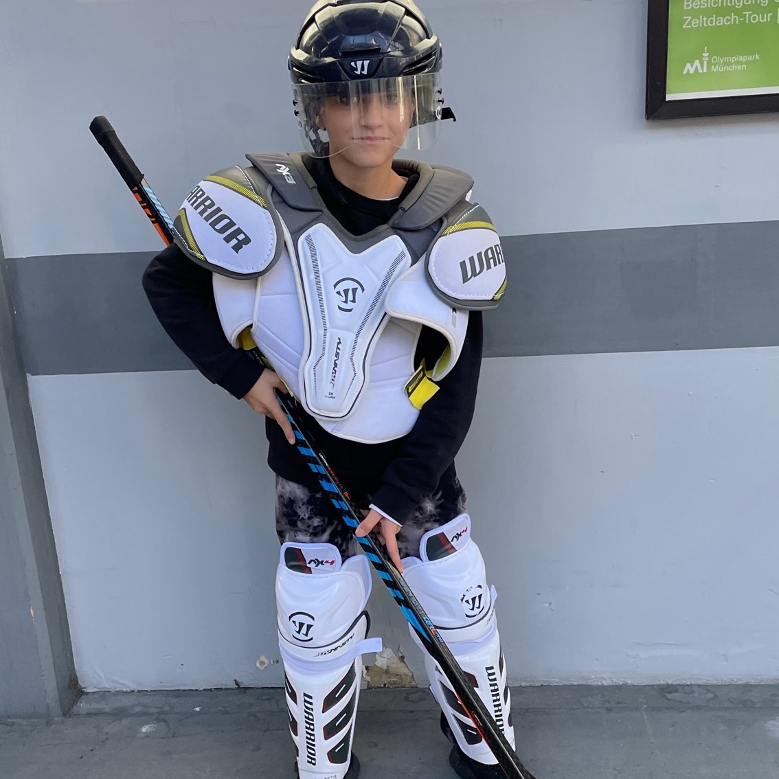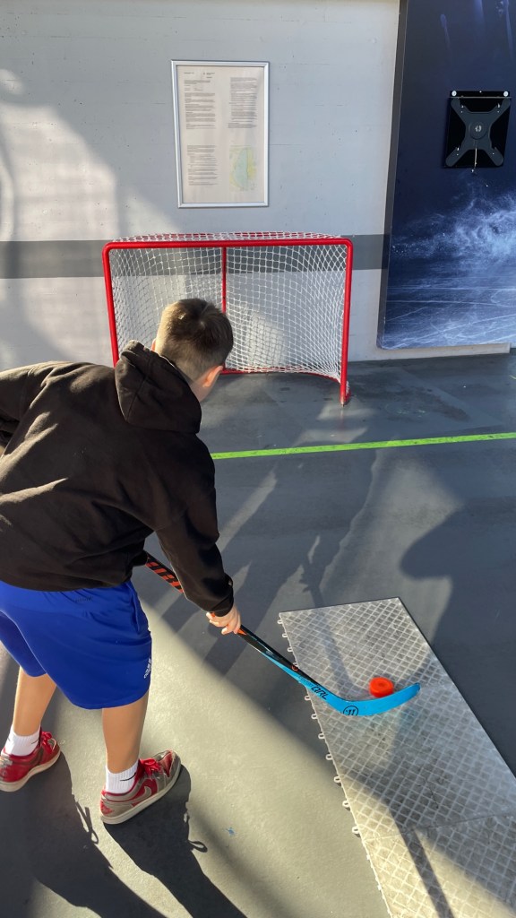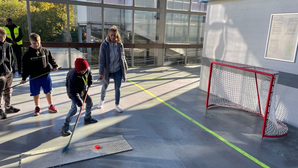 Die anwesenden Schülerinnen und Schüler konnten aber auch selbst aktiv werden und sich im Torschuss versuchen oder die Eishockeyausrüstung kennenlernen. Da gab es viel zum Anziehen: zum Anlegen der kompletten Ausrüstung benötigt man gut 15 – 20 Minuten.