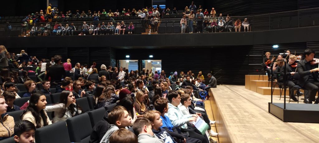 Eine vergnügliche Stunde verlebten die Schülerinnen und Schüler mit dem Odeon-Jugendsinfonieorchester München unter Leitung des Dirigenten Julio Doggenweiler Fernández. Das klanggewaltige Musikstück „Bilder einer Ausstellung“ von Modest Mussorgsky, das der russische Komponist in Andenken an seinen Malerfreund Viktor Hartmann geschrieben hat, ist in der Bearbeitung von Maurice Ravel für das Orchester ein wahres Feuerwerk.