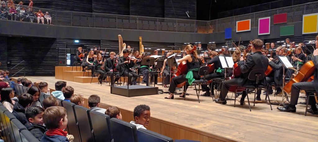 Gespannt hörten wir zunächst dem Stimmen der einzelnen Instrumente zu, um dann den Dirigenten und die Schauspielerin Tina Güllich zu empfangen. Sie führte uns durch das Musikstück und gab unserer Phantasie mehr als einen Anstoß. So begegneten wir dem Gnom, dem alten Schloss, einem Ochsenkarren und dem Ballett der unausgeschlüpften Küken. Tina Güllich ließ uns im Takt klatschen, singen oder auch stapfen. Ein tolles, anschauliches Hörerlebnis dank der musikalischen Leistung der jungen Instrumentalisten. Für die meisten Kinder unserer Schule war es ihr erstes klassisches Konzert.