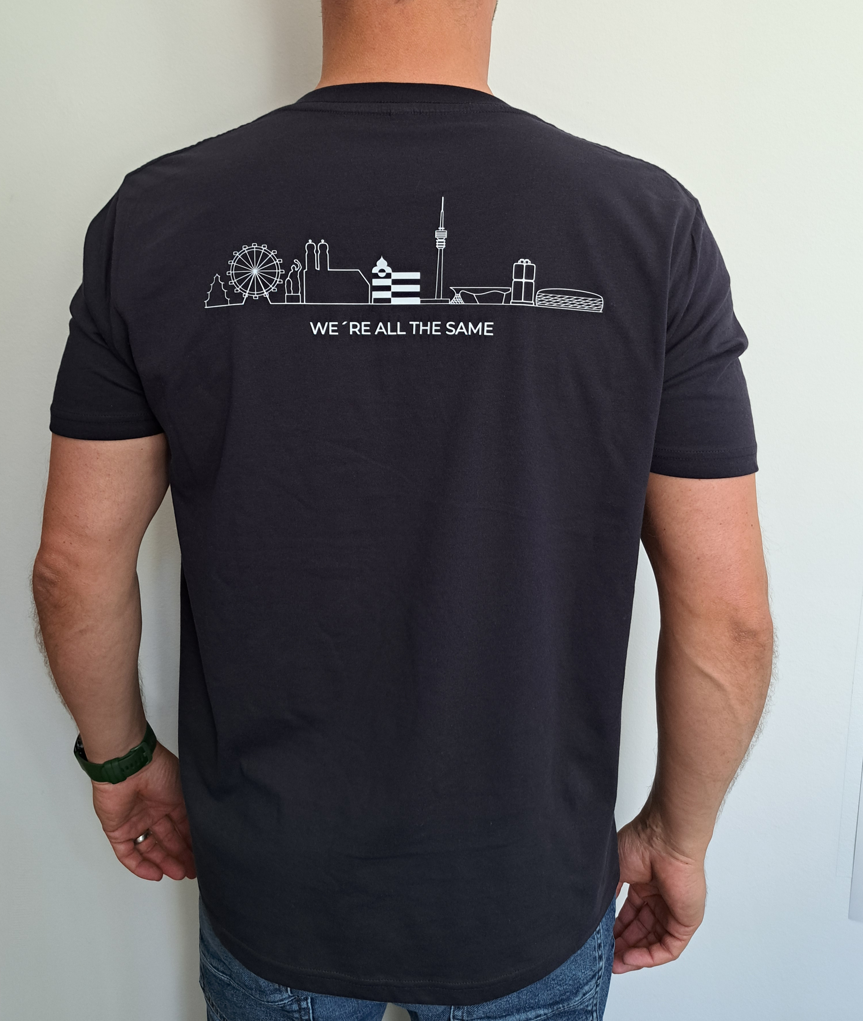 Die Herausforderung bestand darin, das Design der Skyline druckfähig zu gestalten. Herr Giefer fand eine Lösung und die Suche nach einem Druckpartner, einem Händler für die Shirts konnte beginnen und mit Probedrucken finalisiert werden.
