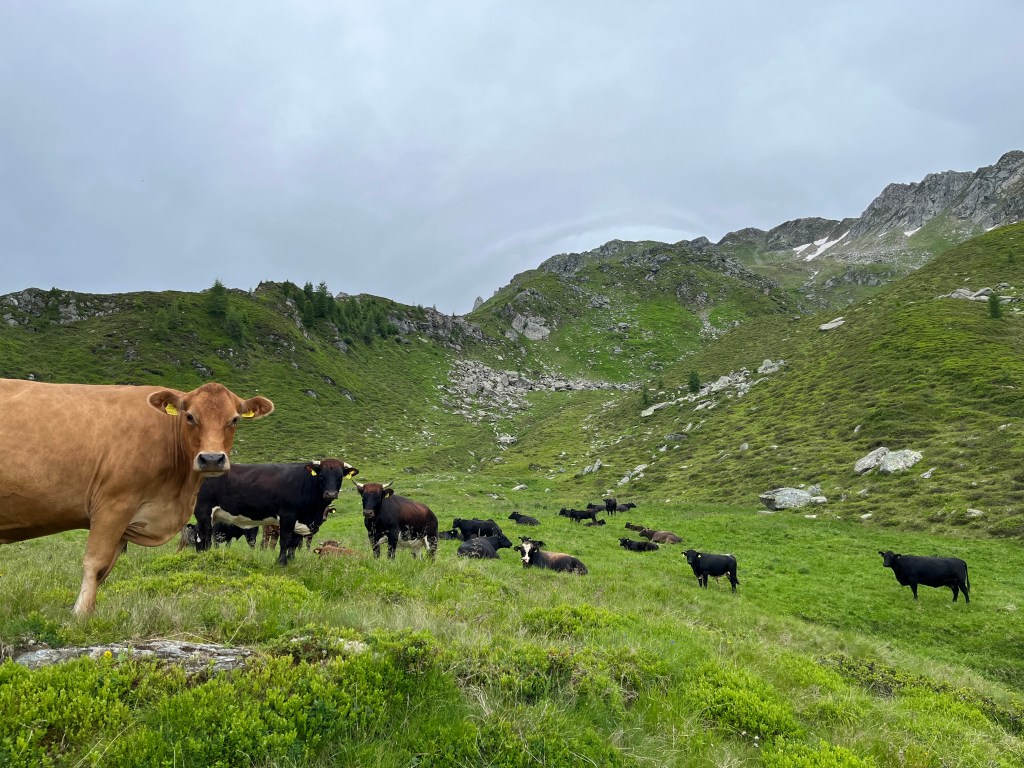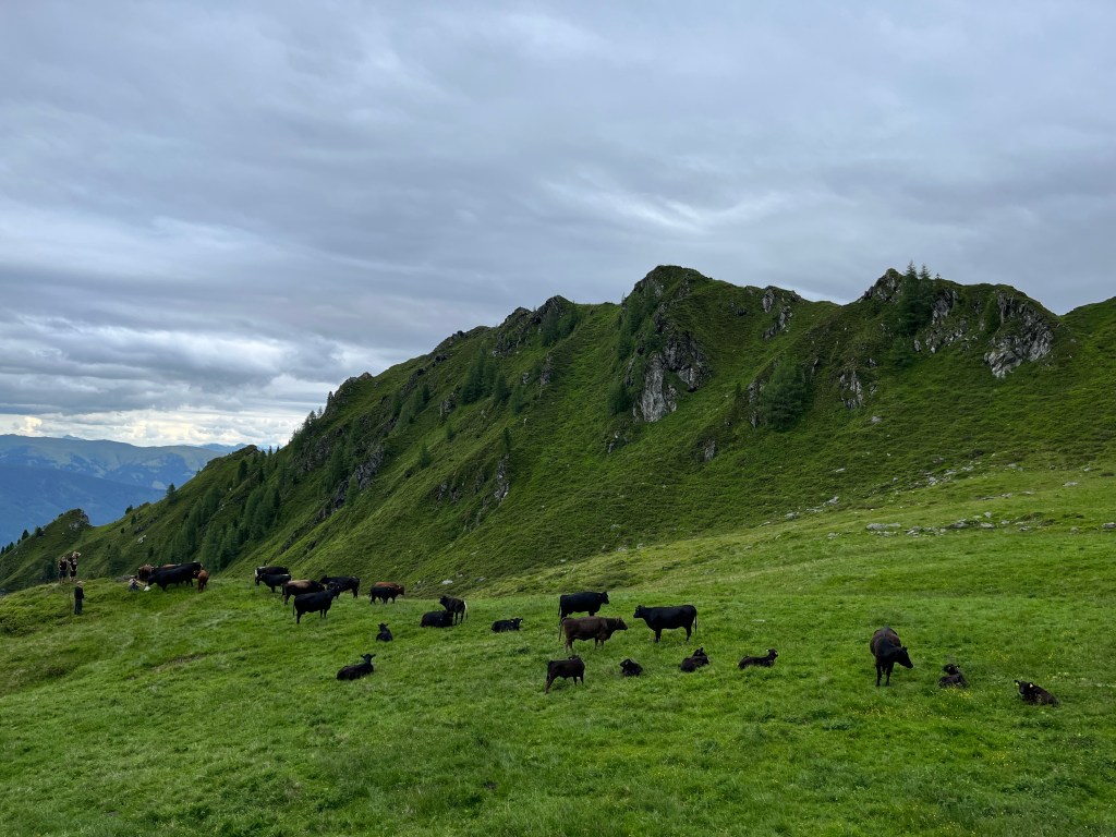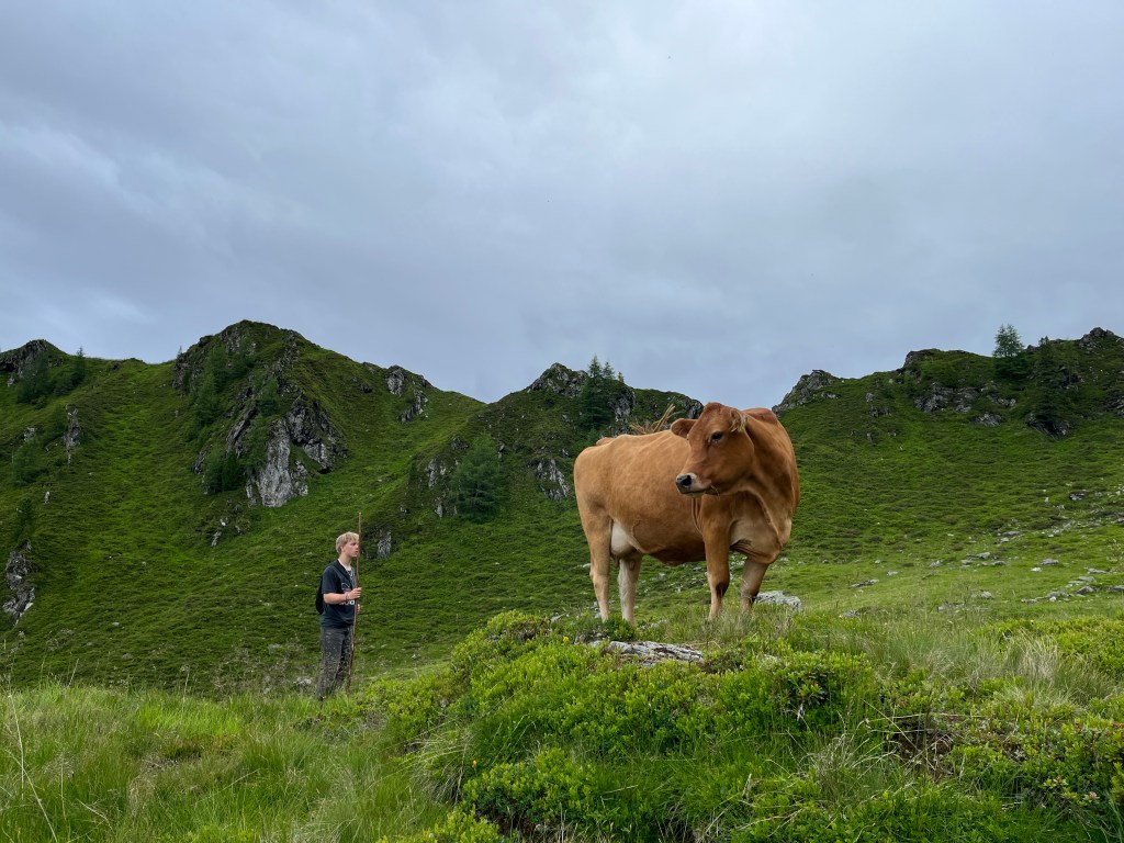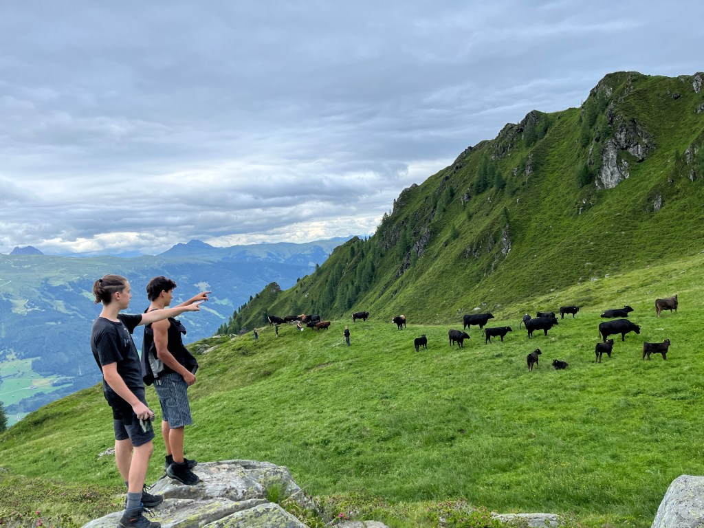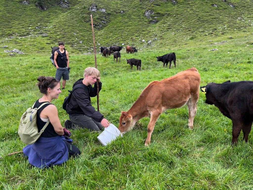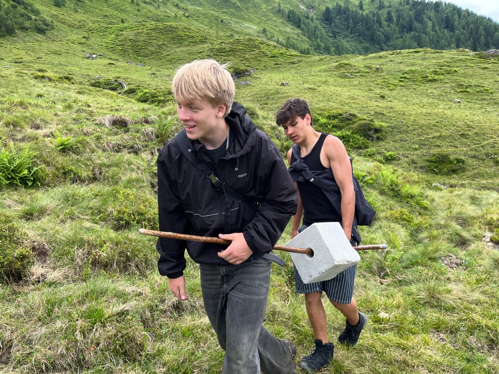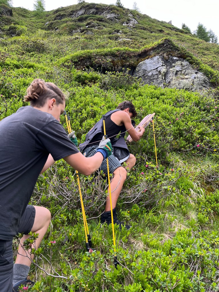 Team Hochalm ging gemeinsam mit Claudia, einem 25 Kilo Leckstein und Weidezaun Equipment querfeldein auf die Hochalm zur Mutterkuhherde. Größte Hochachtung geht an Emil und Oskar, die den schweren Salzstein mehrere hundert Höhenmeter bis ganz nach oben trugen. Wir passierten die Quelle, von der aus die Wildalm ihr Wasser bezieht, sowie die Ruinen von ehemaligen Melkständen aus früherer Zeit. Auf der Hochalm angekommen fanden wir leider kein einziges Tier vor und mussten weiter aufsteigen, da die Herde bereits weiter nach oben gewandert ist. Auf dem Weg sahen wir von Weitem eine der beiden Ziegenherden. Ausgestattet mit Fernglas zählten wir die 17 Tauernscheckenziegen ab, die zum Glück vollständig waren. Dann endlich fanden wir die Mutterkuhherde mit den Jungtieren. Ein beeindruckender Anblick wie die Tiere auf einem Hochplateau entspannt im Gras lagen, bis sie uns entdeckten, die Herde umgehend nervös wurde und sich in Habachtstellung begab. Beim richtigen Verhalten gegenüber den Tieren, das uns Claudia zuvor ausführlich erklärte, geht von einer Mutterkuhherde mit Jungtieren keinerlei Gefahr für Menschen aus. Schwierig wird es beim Mitführen von Hunden, besonders wenn diese nicht angeleint sind. Durch das Fehlverhalten der Hundebesitzer kommt es leider regelmäßig zu tödlichen Unfällen mit Kühen im Alpenraum, da diese ihre Kälber unerschrocken verteidigen. Nachdem wir alle 35 Tiere vollständig abgezählt und sie sich an uns gewöhnt hatten, ließen sie es zu, dass wir uns ihnen näheren konnten. Oskar gelang es sogar das Vertrauen des Stiers der Herde zu gewinnen. Im Anschluss an die Versorgung der Tiere mit Salz, stand das Aufbauen eines Weidezauns an, damit die Herde nicht über einen Grat in das angrenzende Tal weiterwandert.