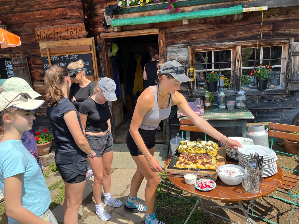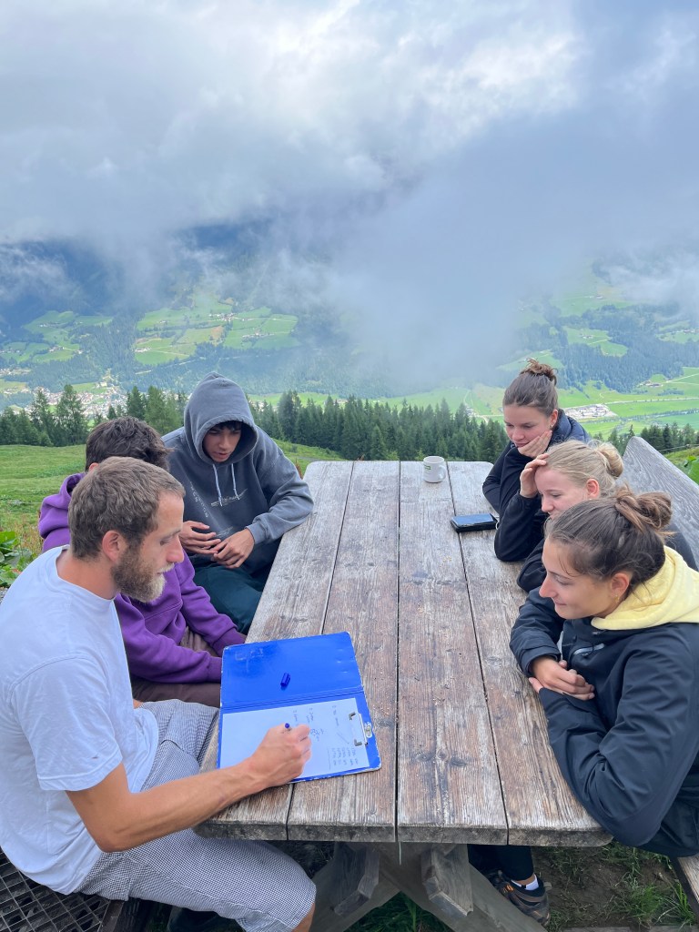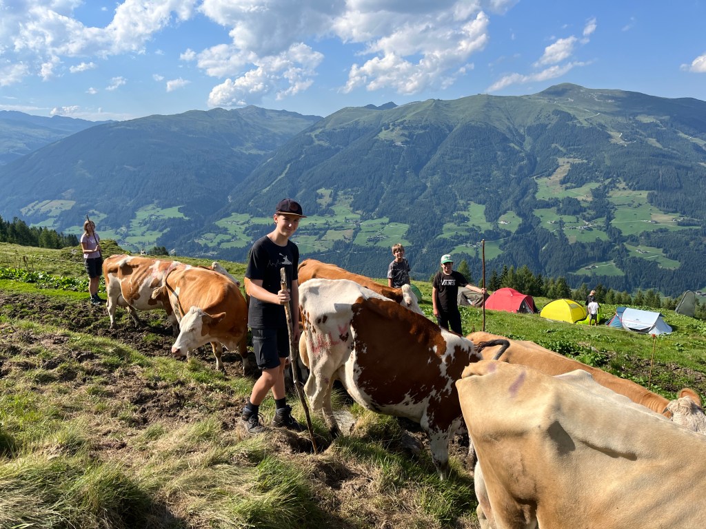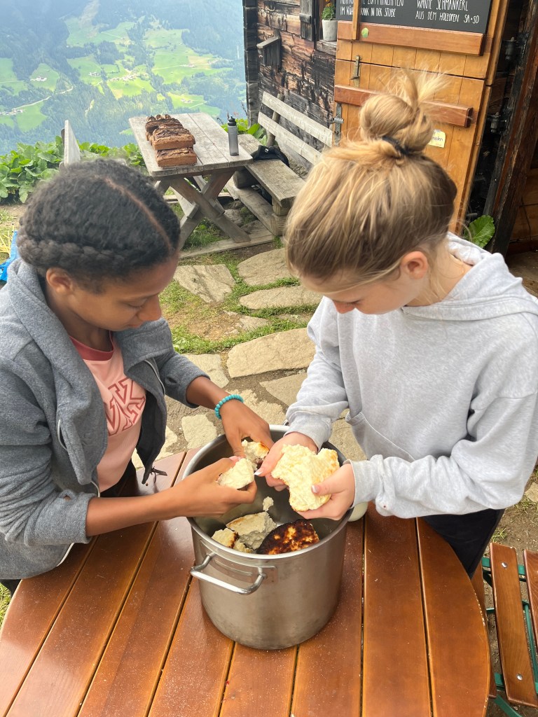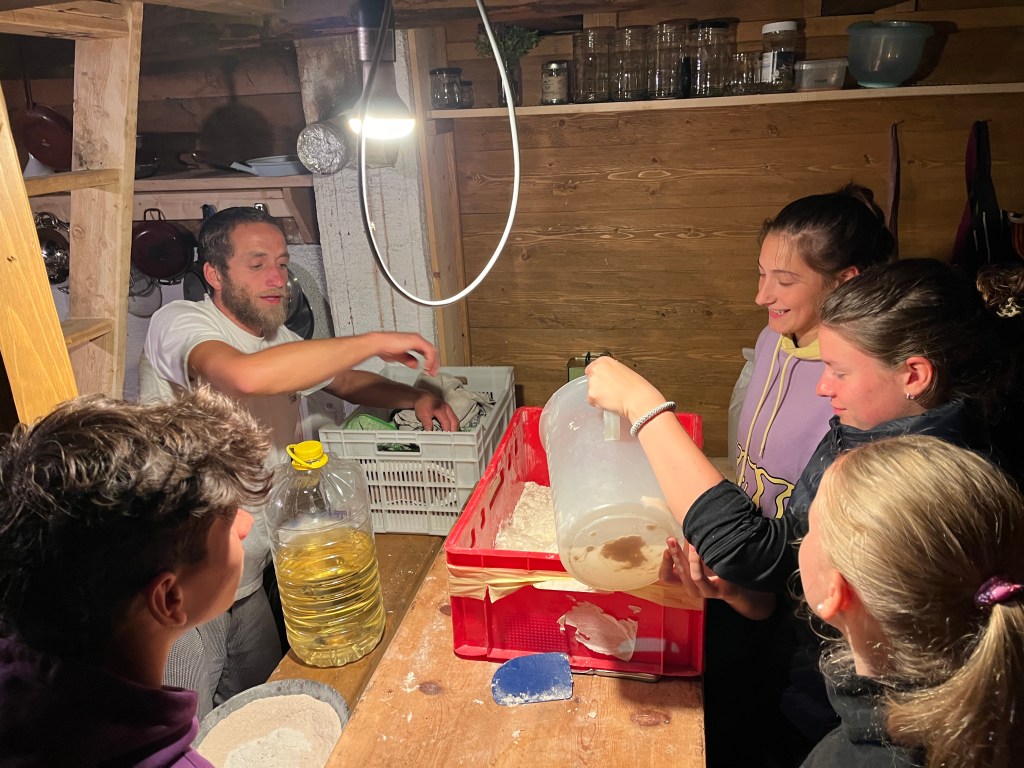 Bei unserem Alm-Projekt (er)lebten wir Almwirtschaft und deren Bedeutung für den alpinen Raum, hautnah! Wir mussten uns um die Tiere kümmern, Milchkühe treiben, Brot und Süßspeisen backen sowie sämtliche Arbeiten verrichten, die auf einer Alm anfallen. Auch bei der Zubereitung von Frühstück, Mittag- und Abendessen sowie beim Abspülen haben wir tatkräftig mit angepackt.