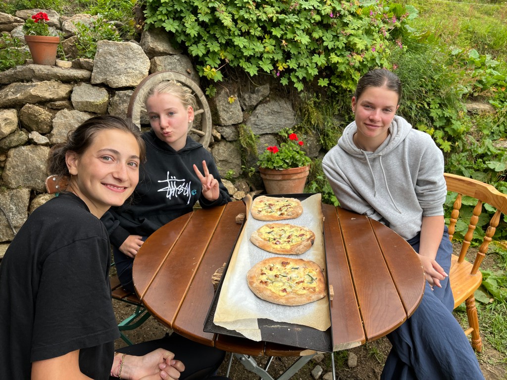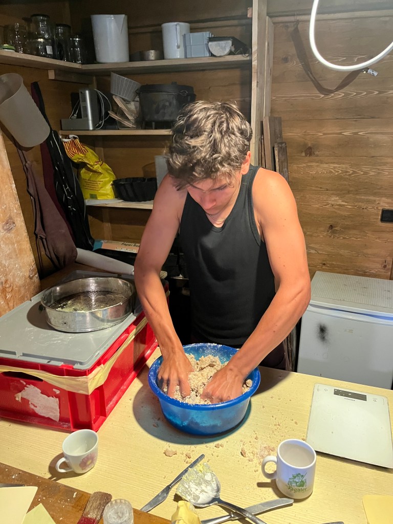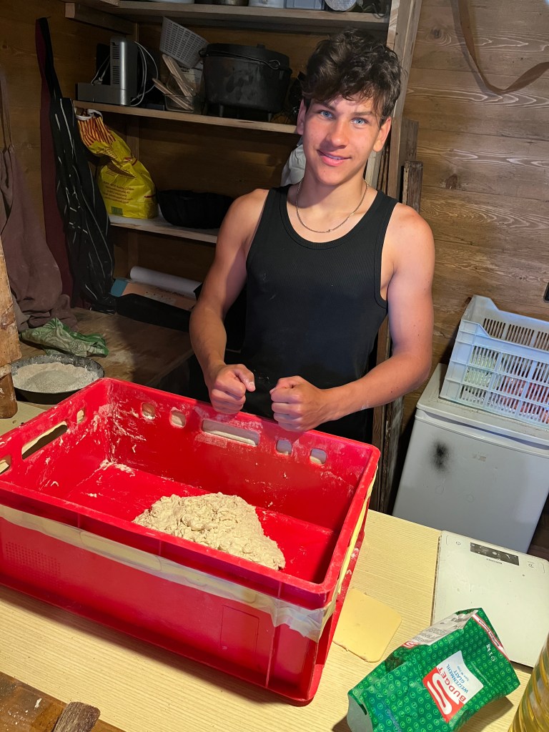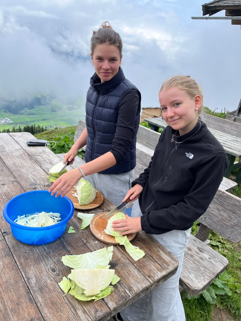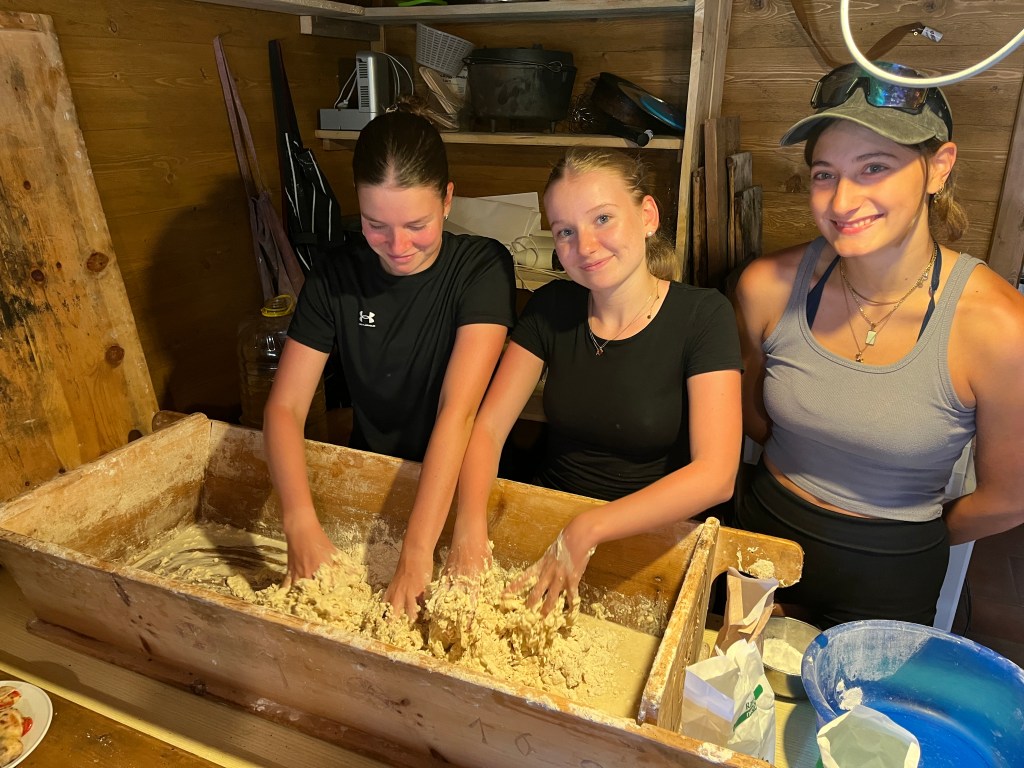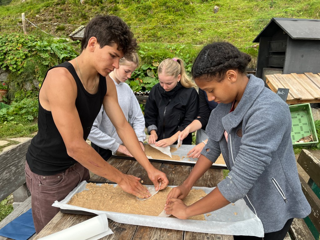 Am Mittwoch unterstützen Marie und Alina Ronja beim Verlegen der Weidezäune rund um die Alm, während sich ein Großteil der 10. Klässler um die Food Production kümmerte. Der Rest schreinerte weiter an Tisch und Bänken, sammelte Beeren oder erledigte weitere Aufgaben. Auf einer Alm muss man wissen, geht die Arbeit nie aus. Immer angeleitet von Simon backten und kochten wir während unserer Zeit auf der Wildalm die leckersten und unterschiedlichsten Speisen: