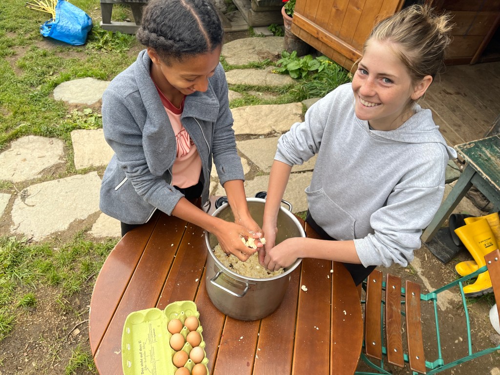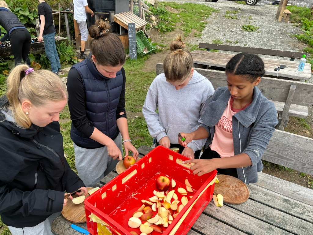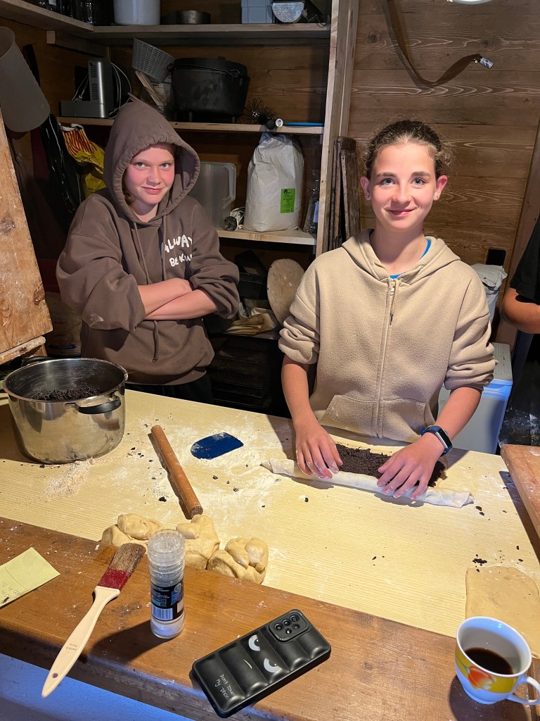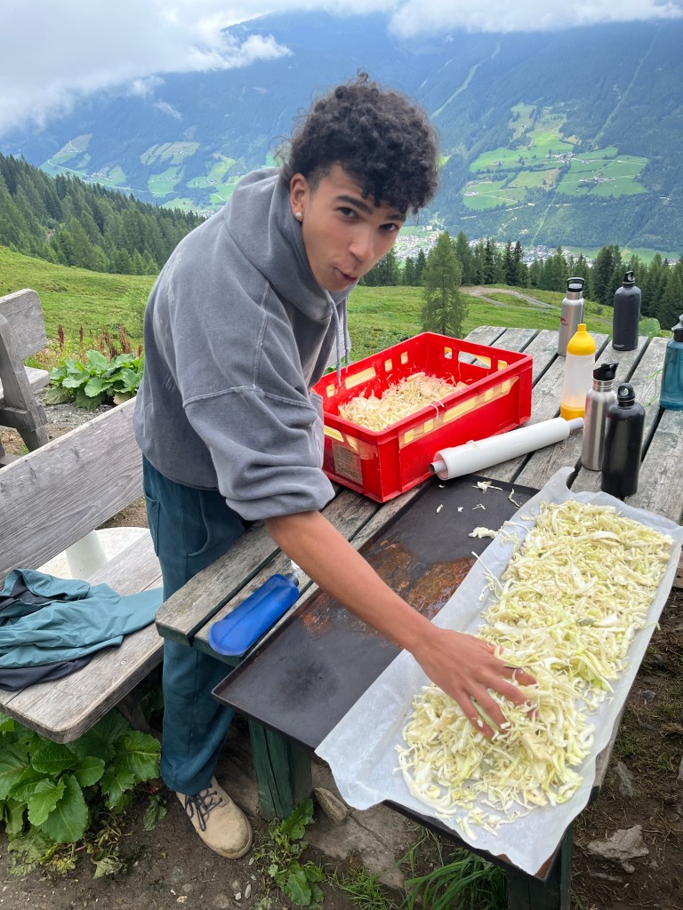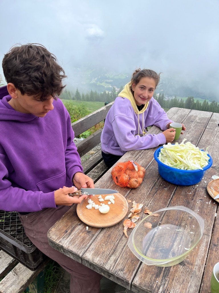 Am Mittwoch unterstützen Marie und Alina Ronja beim Verlegen der Weidezäune rund um die Alm, während sich ein Großteil der 10. Klässler um die Food Production kümmerte. Der Rest schreinerte weiter an Tisch und Bänken, sammelte Beeren oder erledigte weitere Aufgaben. Auf einer Alm muss man wissen, geht die Arbeit nie aus. Immer angeleitet von Simon backten und kochten wir während unserer Zeit auf der Wildalm die leckersten und unterschiedlichsten Speisen: