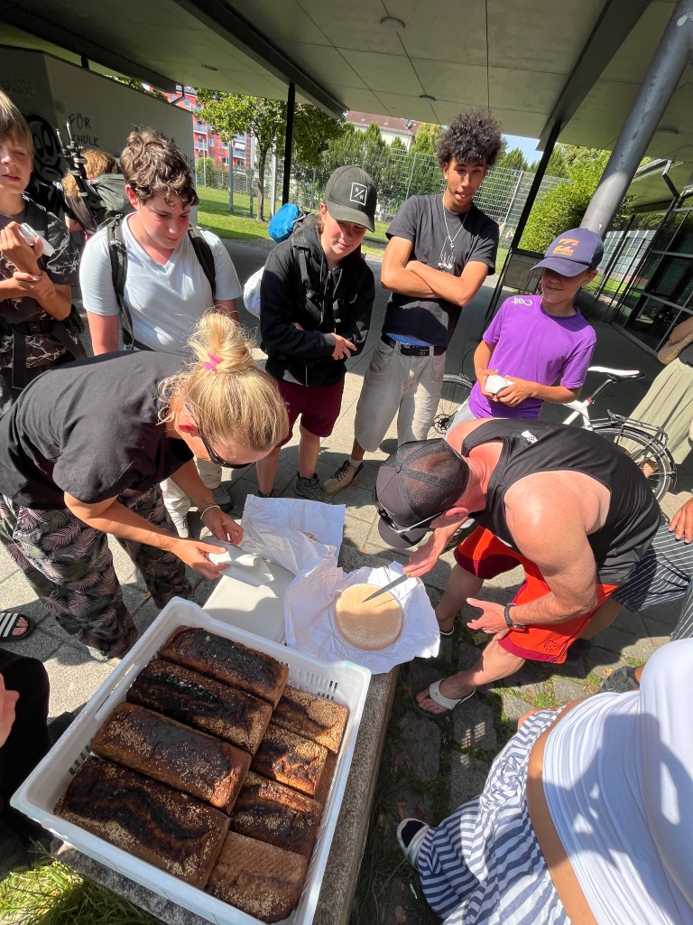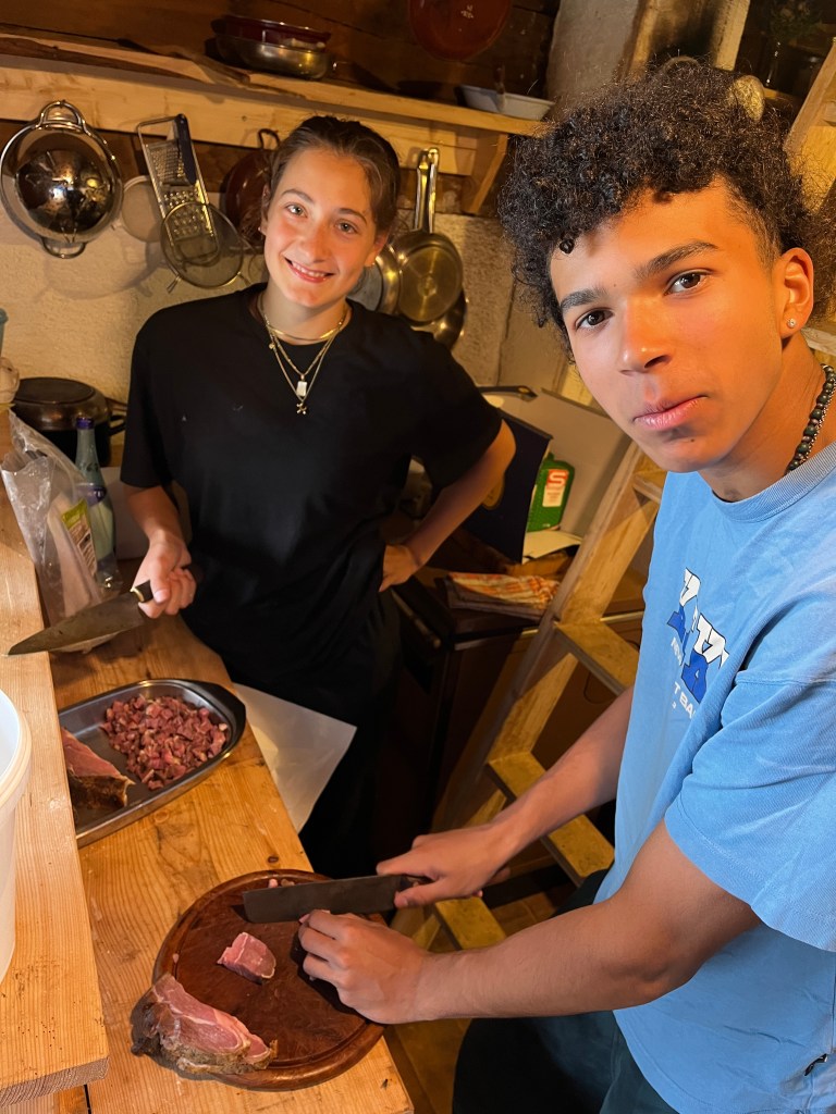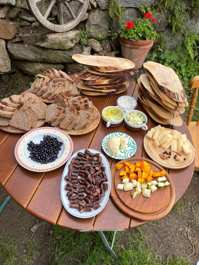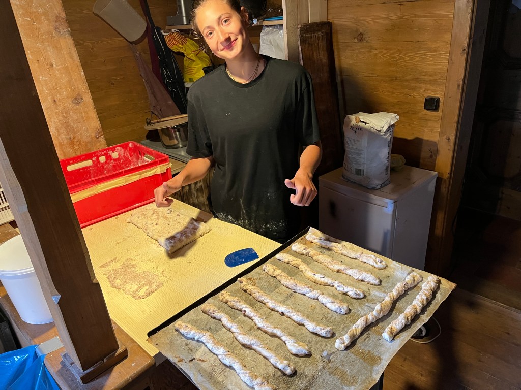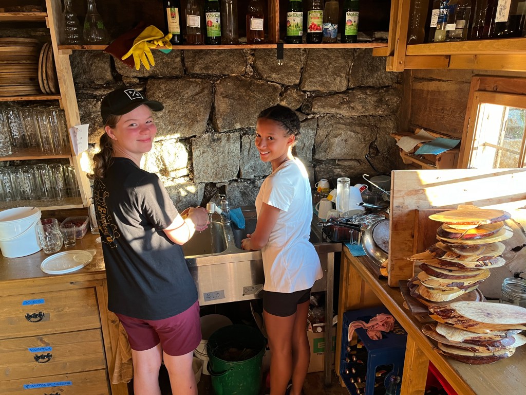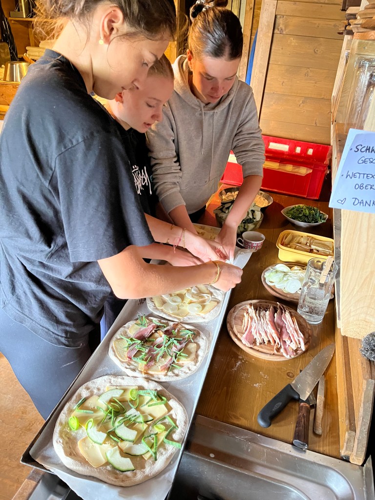 Am Mittwoch unterstützen Marie und Alina Ronja beim Verlegen der Weidezäune rund um die Alm, während sich ein Großteil der 10. Klässler um die Food Production kümmerte. Der Rest schreinerte weiter an Tisch und Bänken, sammelte Beeren oder erledigte weitere Aufgaben. Auf einer Alm muss man wissen, geht die Arbeit nie aus. Immer angeleitet von Simon backten und kochten wir während unserer Zeit auf der Wildalm die leckersten und unterschiedlichsten Speisen: