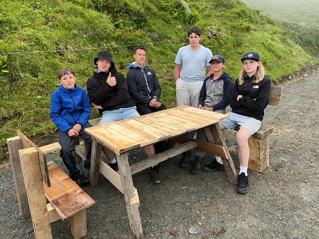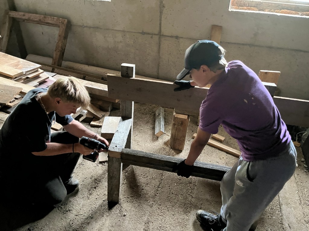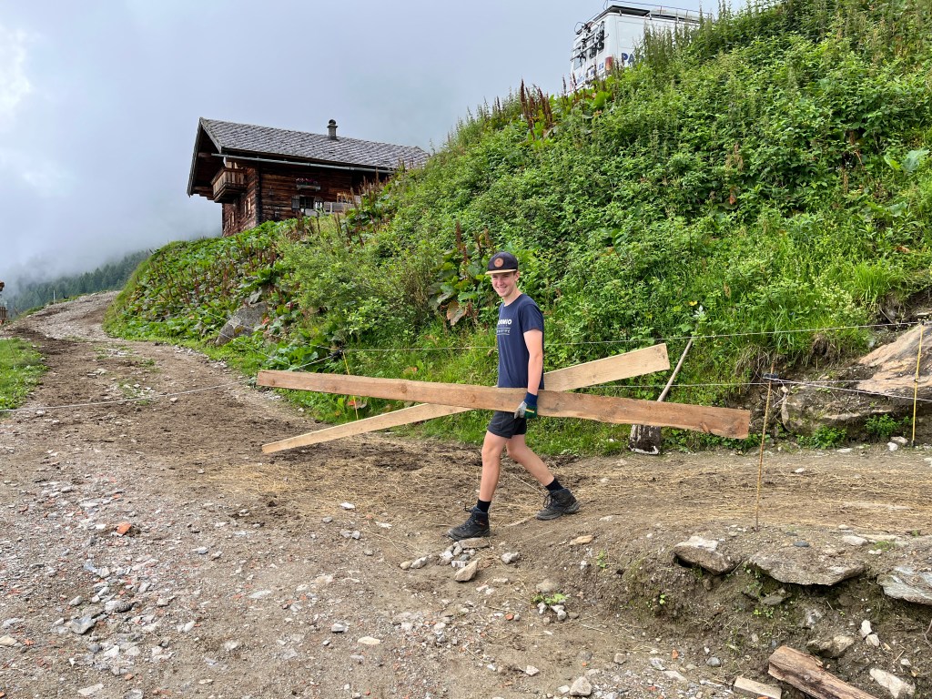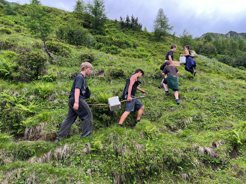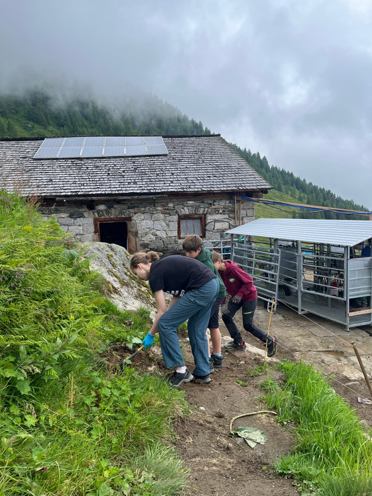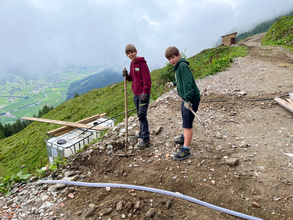 Team Bautrupp kümmerte sich gemeinsam mit Andi um sämtliche handwerkliche Aufgaben die zu erledigen waren, z.B. Instandsetzung von Holzzäunen und Wegen sowie Vergraben von Leitungen. Zusätzlich begonnen die Kids selbstständig zu schreinern und bauten Bänke sowie einen Tisch für die Wildalm.