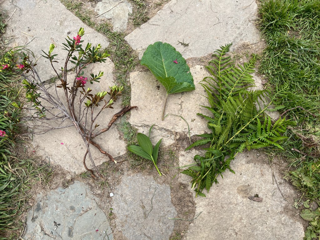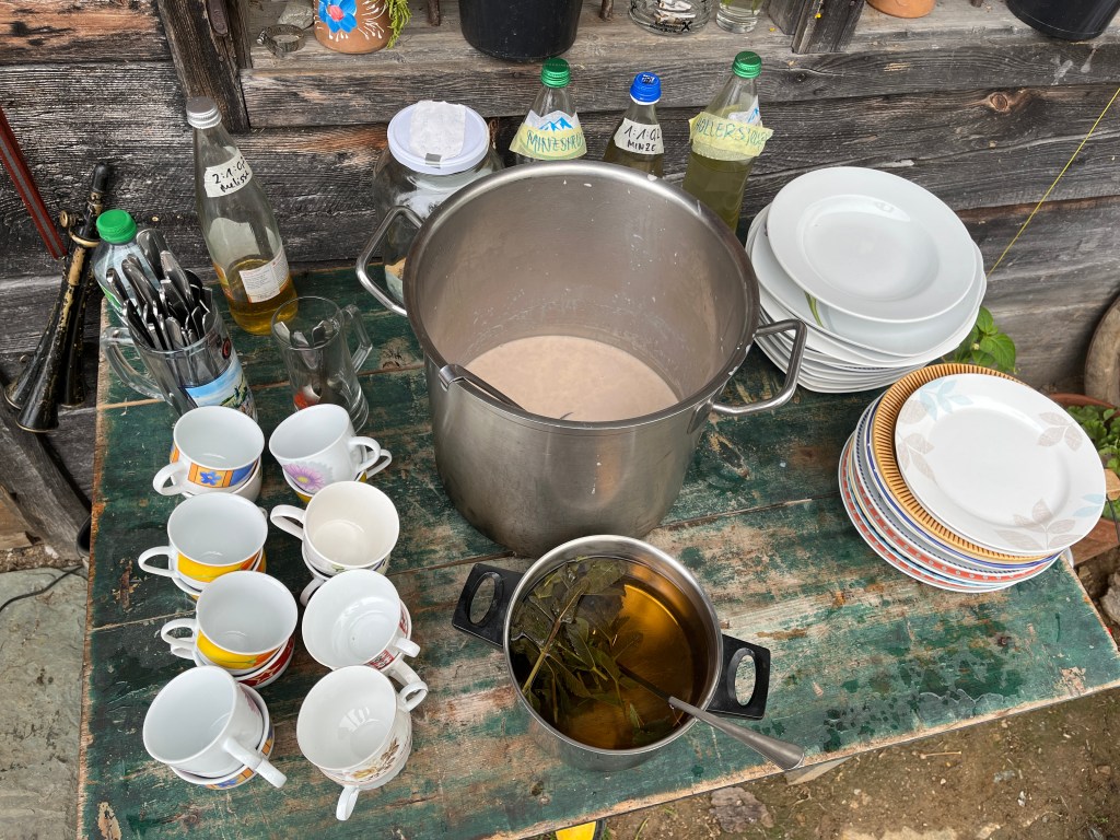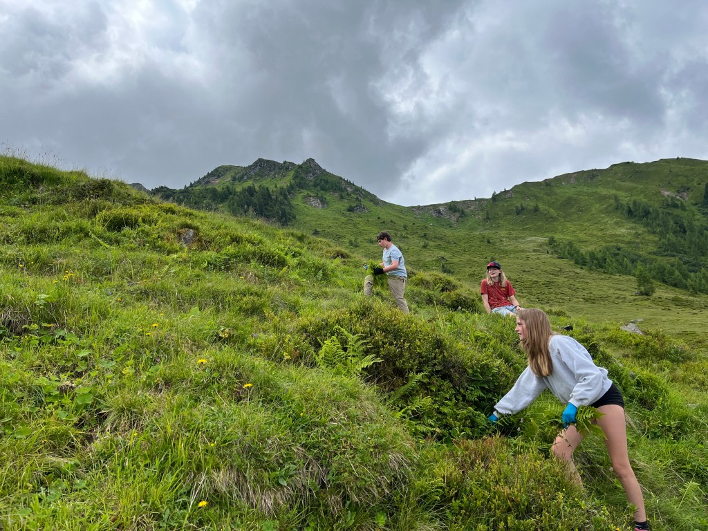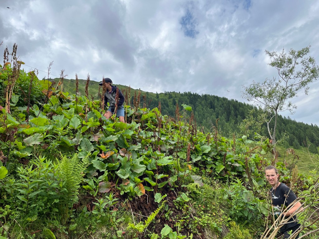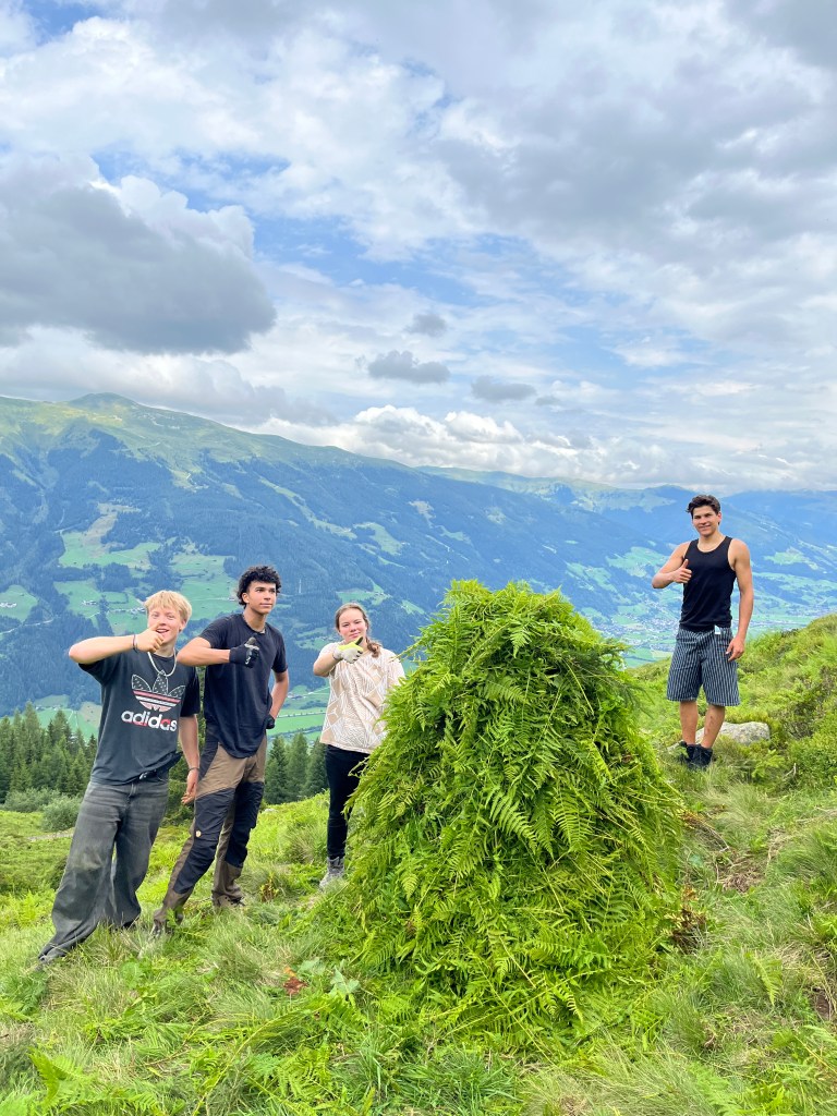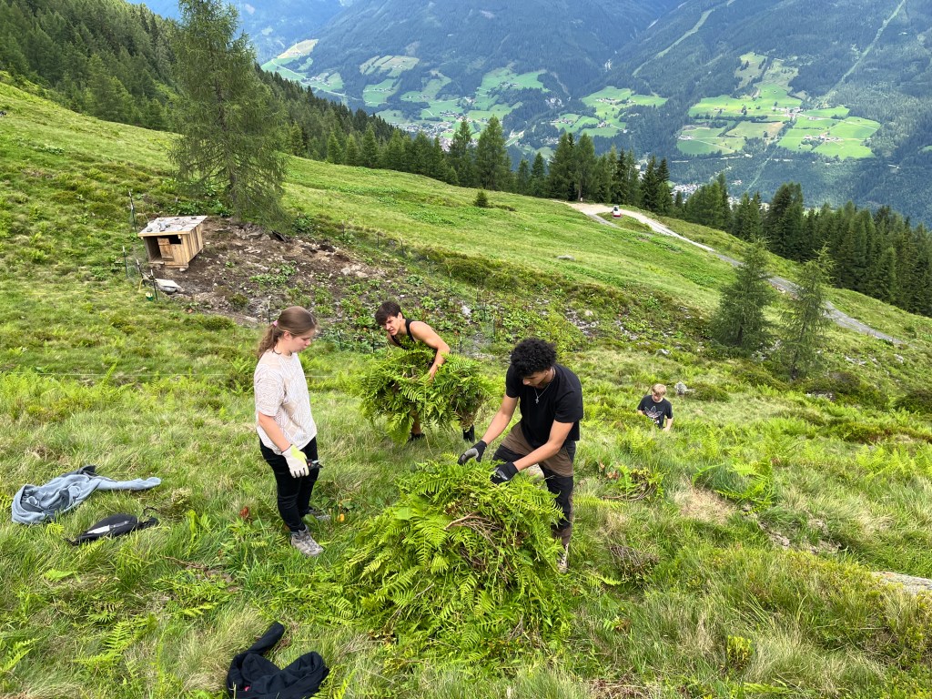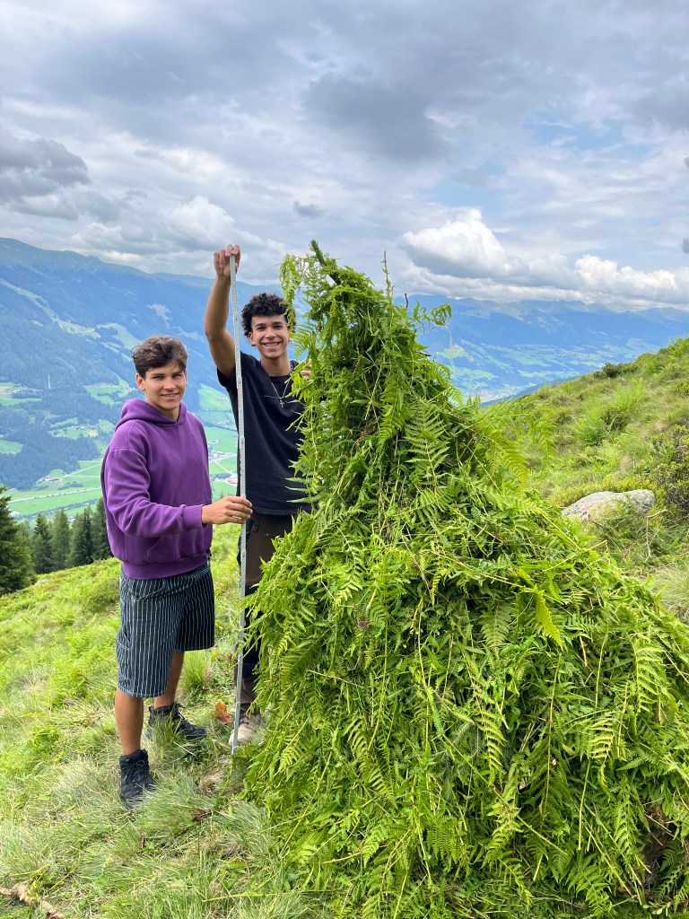 Die Wildalm wurde die letzten zwei Jahre nicht bewirtschaftet und von daher ist die Weidefläche verbuscht und mit Unkräutern zugewachsen. Aus diesem Umstand entwickelte Simon am Dienstagvormittag für die Kids eine Challenge. Eingeteilt in mehrere Teams mussten die Outdoorler die Almunkräuter Alpenampfer, Alpenrose, Farn und weißer Germer sammeln und zu einem Haufen aufschichten. Für den Gewinn des höchsten Haufens wurde spontan Herr Fürst eingebunden: Selbstgebackene fürstliche Weizensauerteig Baguettes für das Gewinnerteam am Sommerfest der MPR. Die gepflückten Unkräuter ließen sich im Anschluss die Mangalica Schweine schmecken.