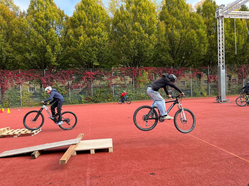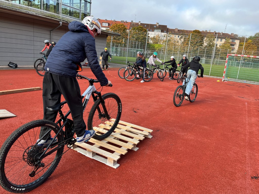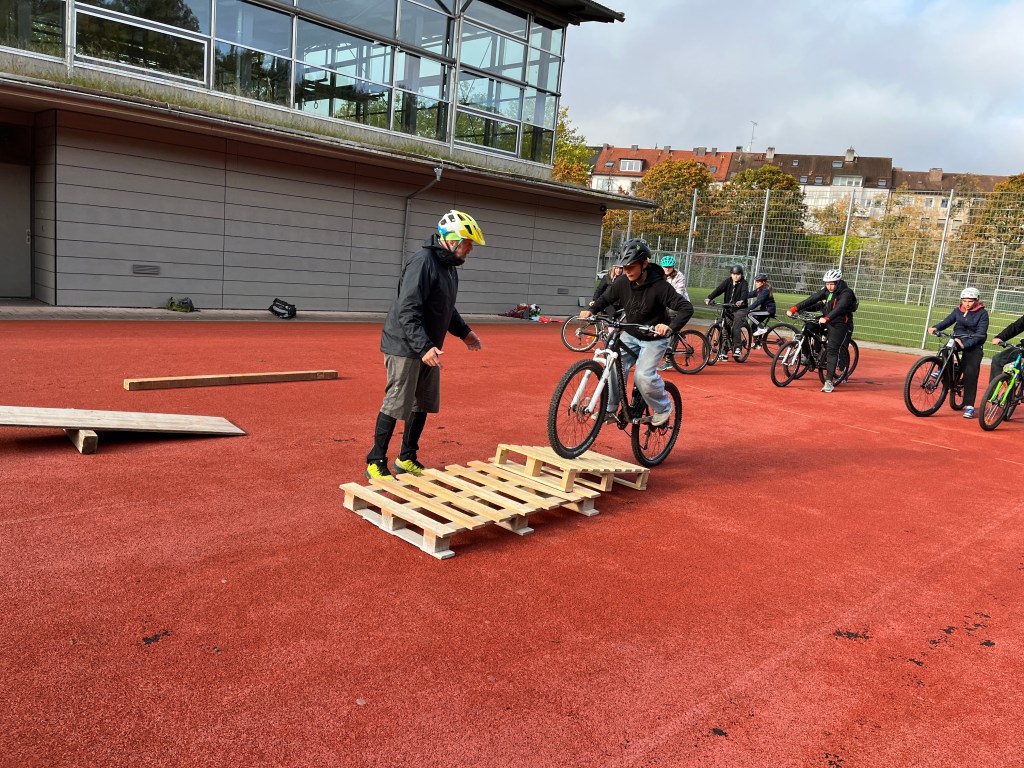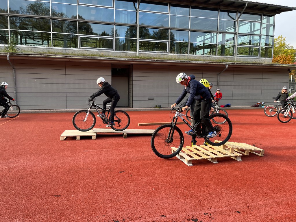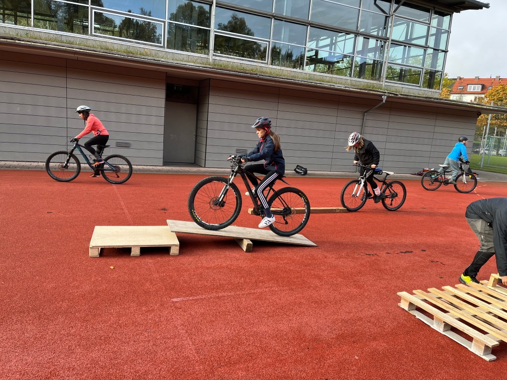 Bevor es jedoch ins Gelände gehen kann, ist das Training und das fahrtechnische Können wichtig. Deshalb gab es Gleichgewichtsübungen auf dem Rad. Unter anderen wurden dazu eine Wippe, verschiedene Paletten und das Balancieren auf einem Balken geübt.