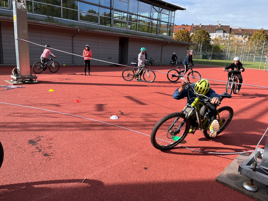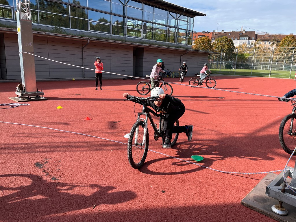 Ebenso gehörten das Fahren eines Slaloms und Fahrradlimbo unter dem Seil dazu.