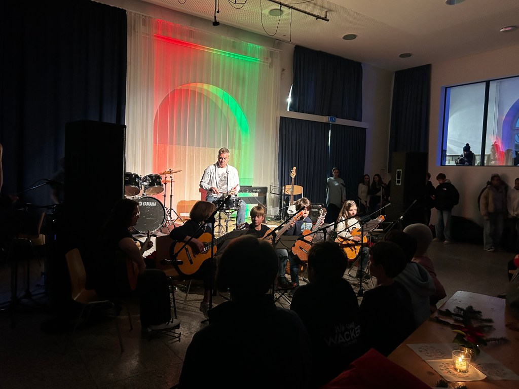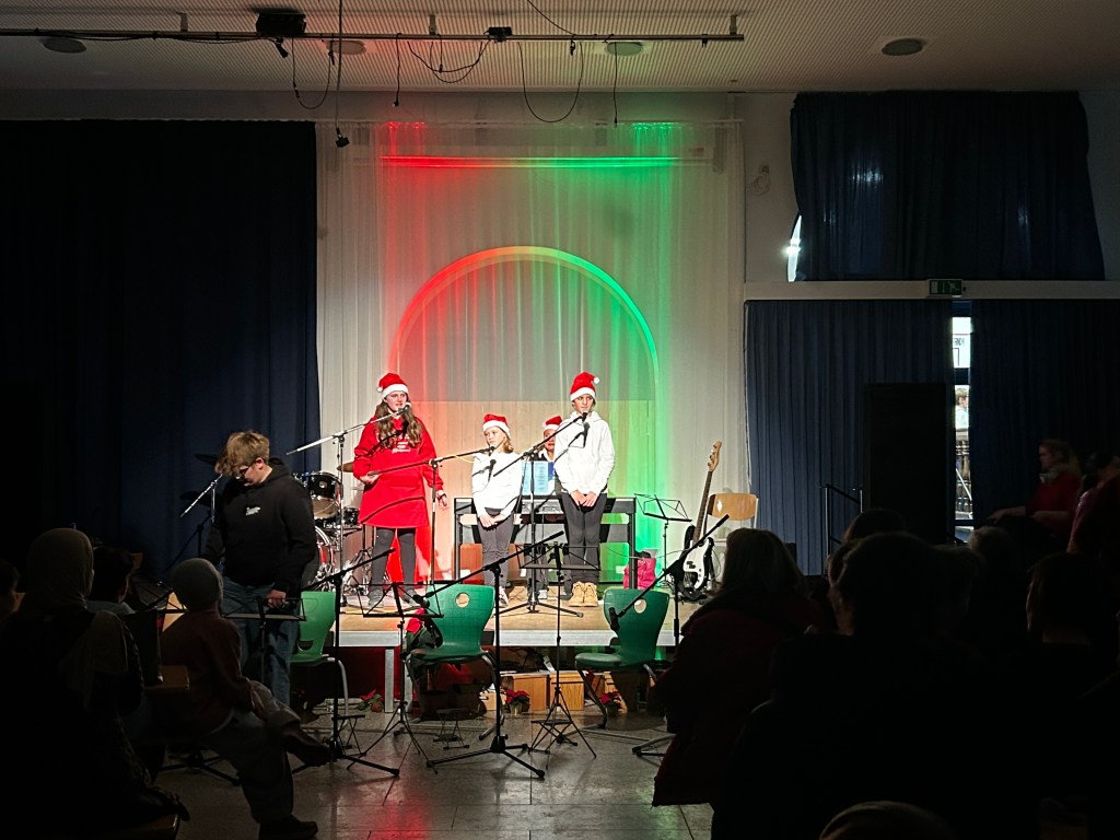 In der Aula sangen die 5. Klässler unter Leitung von Frau Bundle und Frau Fontaine stimmungsvoll ihre Weihnachtslieder. Anschließend erfreute das Konzert der verschiedenen Instrumentalgruppen der Musikschule schola musicae von Frau Busch die Besucher.