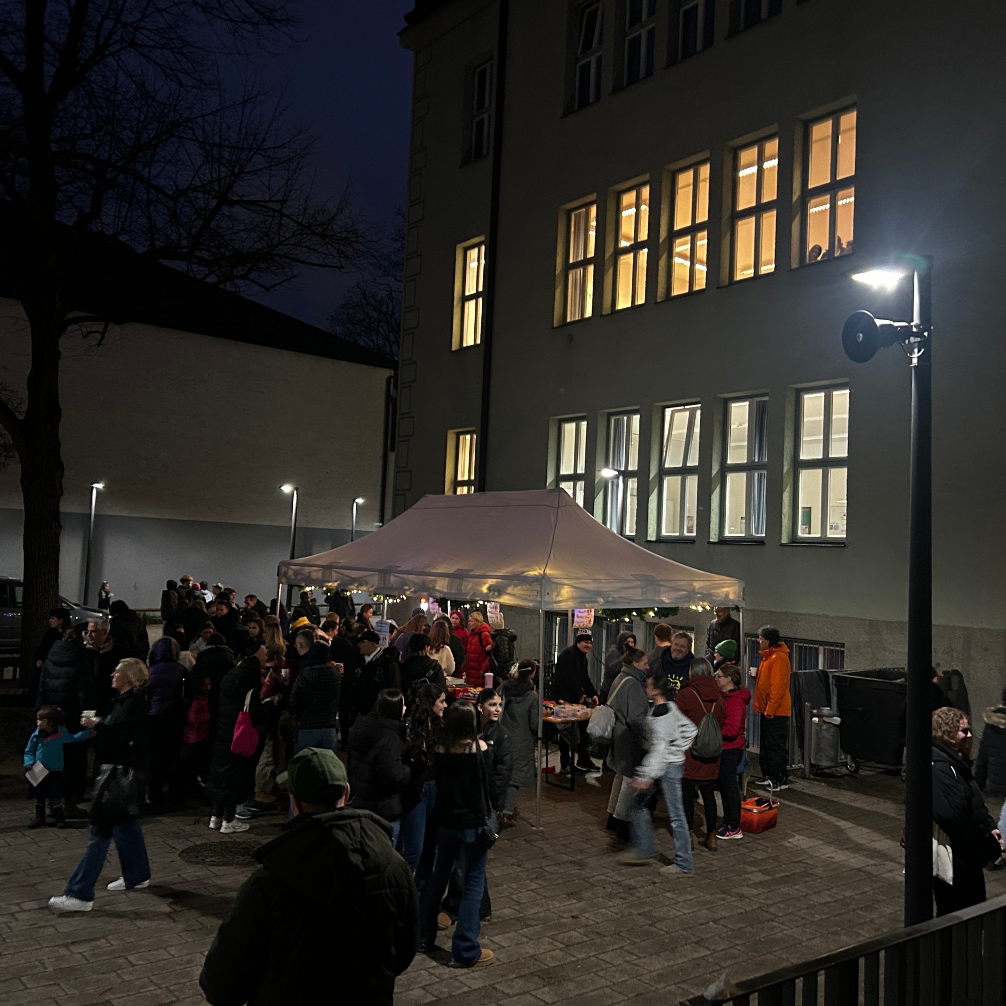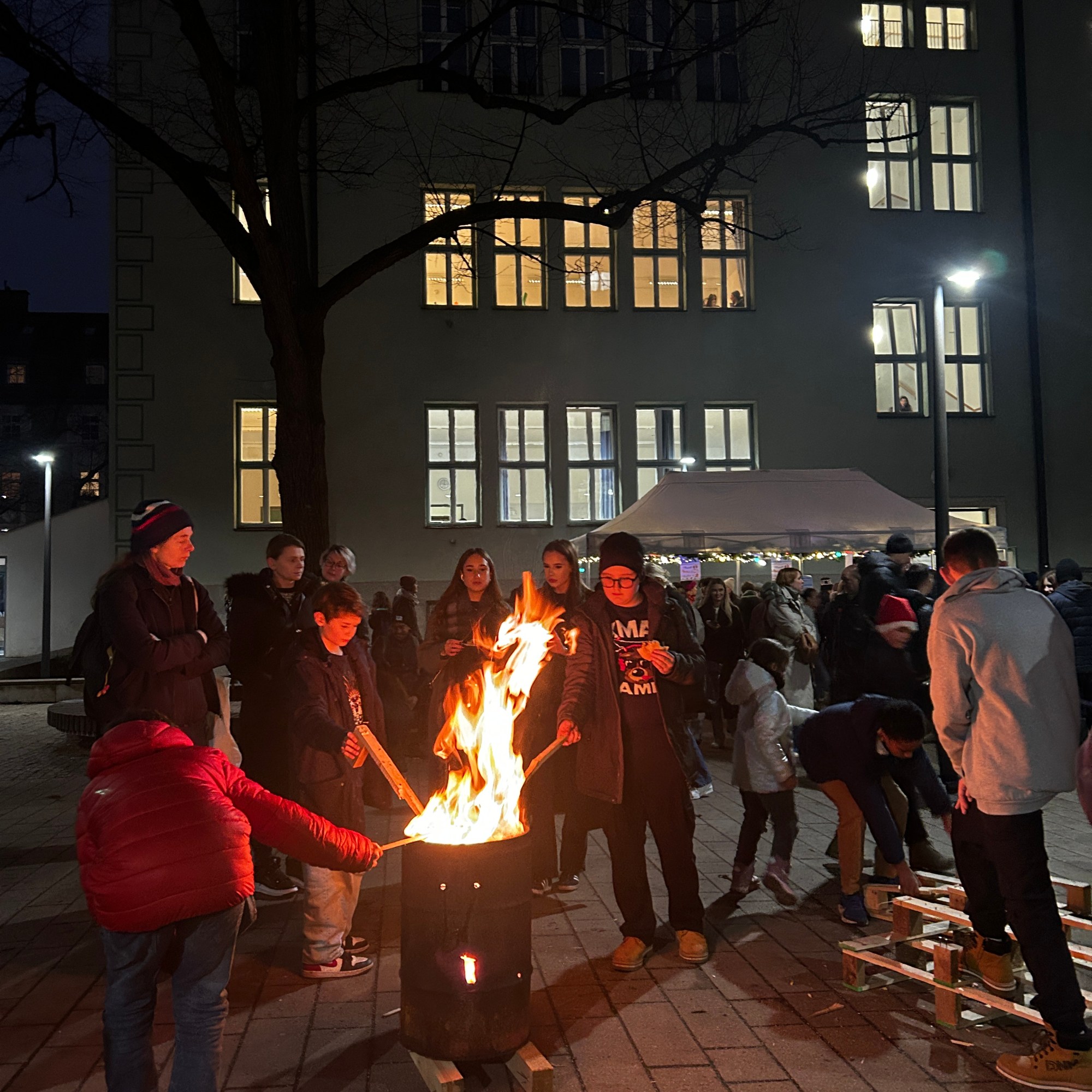 Der Elternbeirat sorgte für das leibliche Wohl. Viele Eltern spendeten dafür Süßes oder Salziges. Die Feuerschale von Herrn Seelos sorgte für die winterliche Stimmung auf dem Pausenhof.