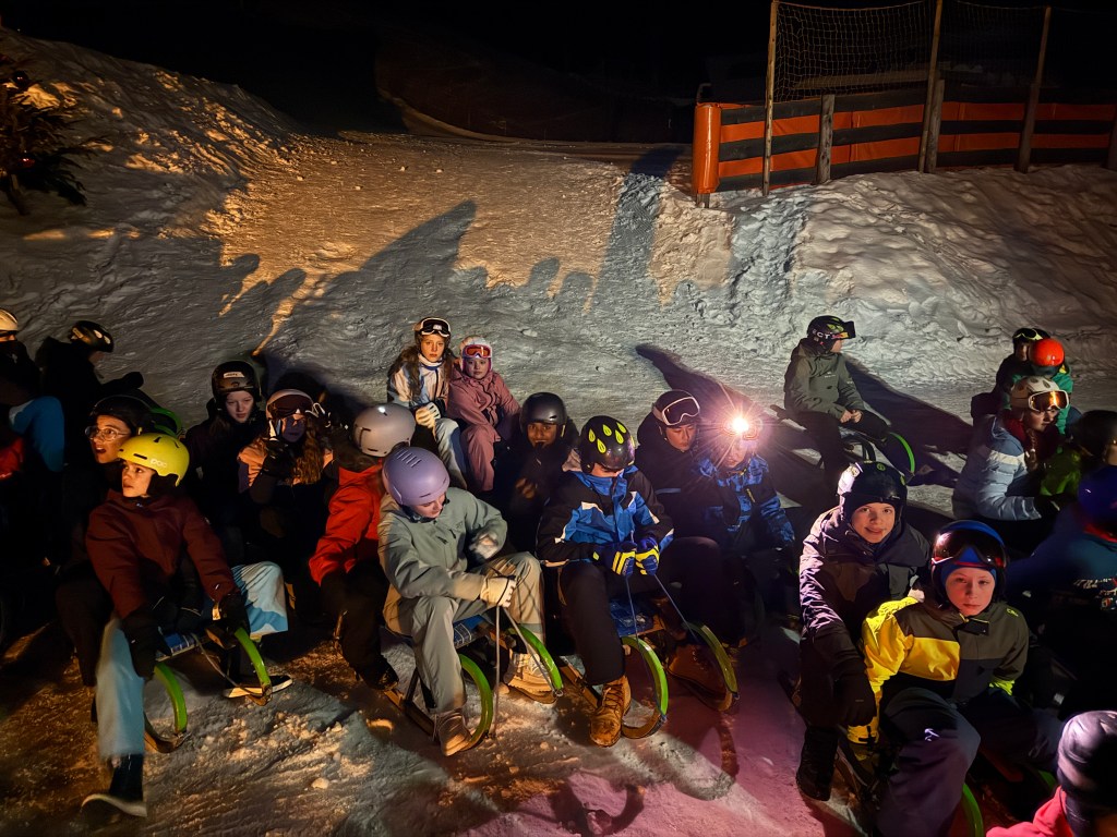 Das abendliche Highlight der Skiwoche stellte die Nachtwanderung zur Alm dar. Nach einer gemütlichen Einkehr mit Almdudler oder Skiwasser ging es mit den Schlitten rasant ins Tal.