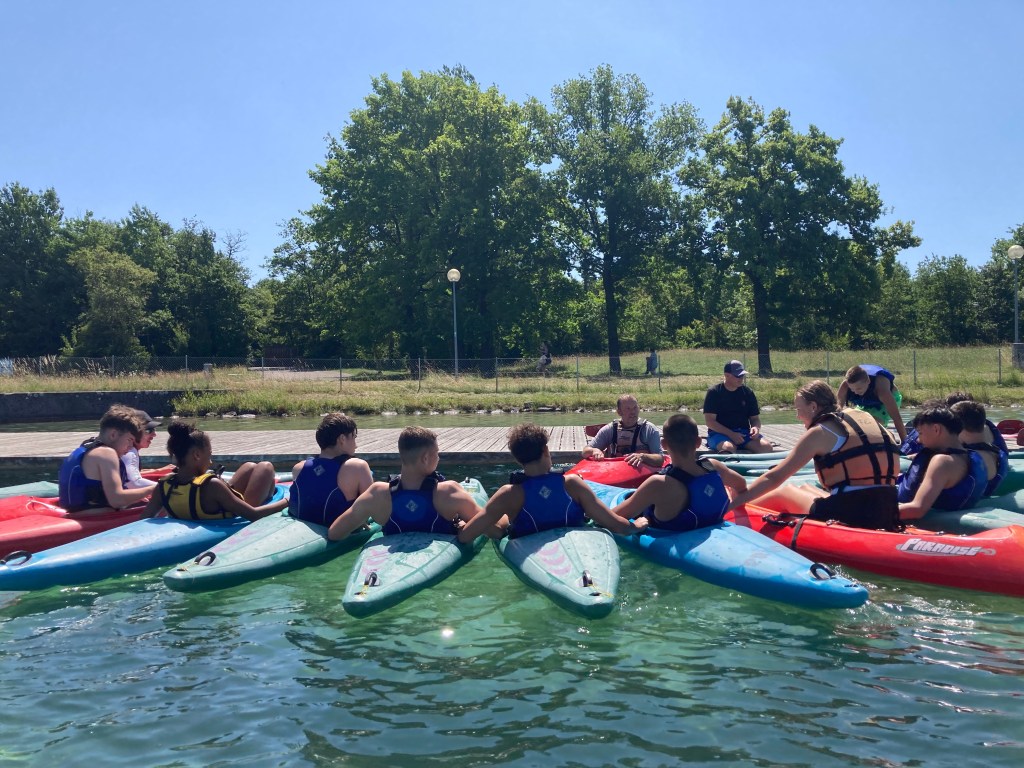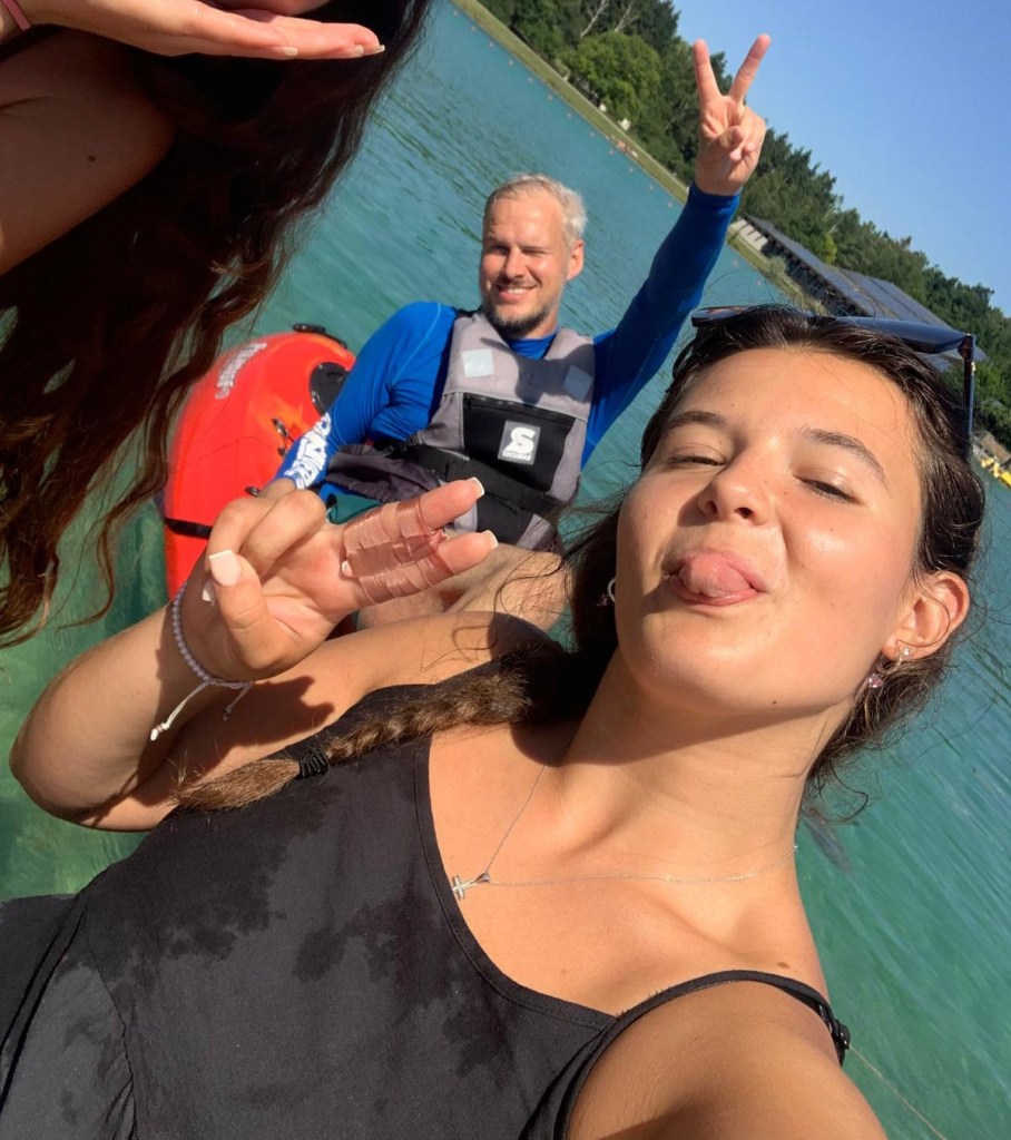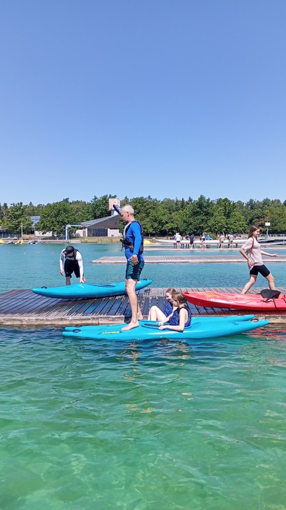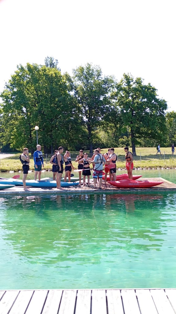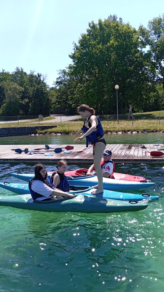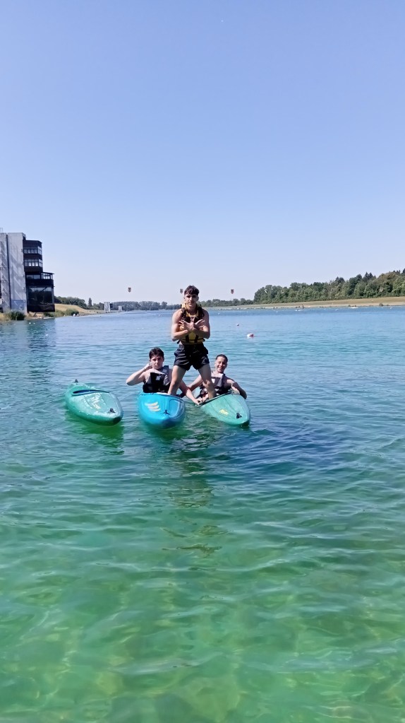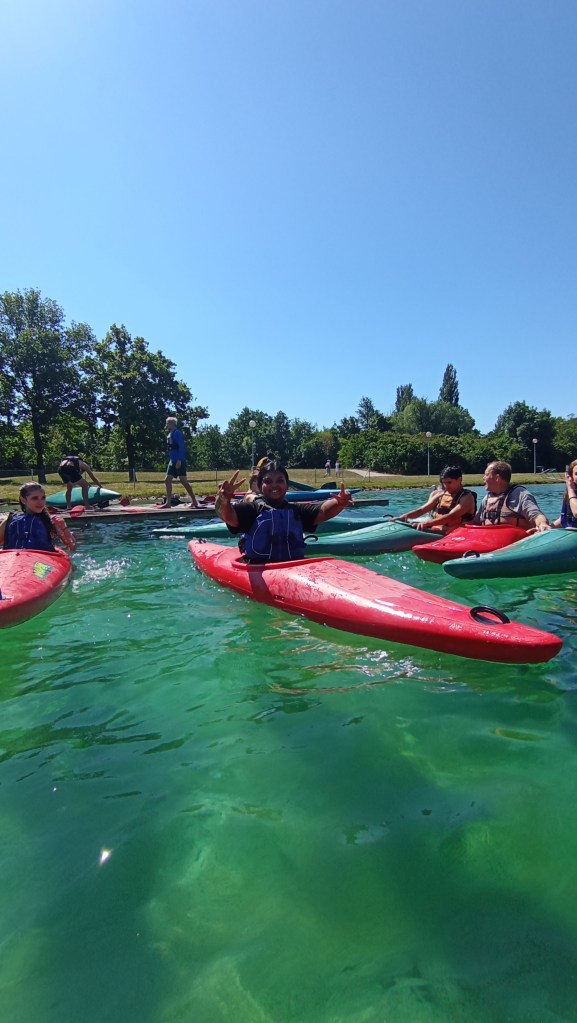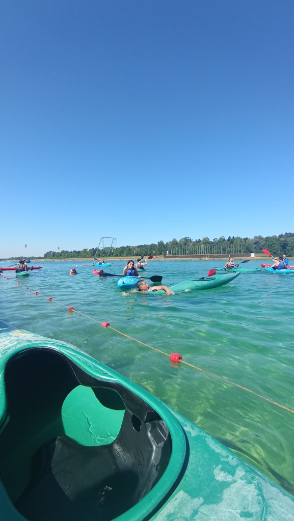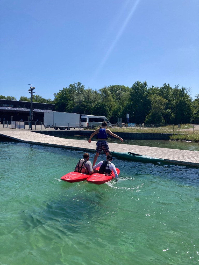 Auch die Klasse 9c besuchte am 02.Juli 2025 die Ruderregattastrecke in Oberschleißheim. Dank Melina haben wir auch ein paar lustige Fotos, die die Kids in den Booten oder im Wasser bei strahlendem Sonnenschein zeigen. Bei den Geschicklichkeitsübungen auf zwei Kajaks stehend, machte der Klassenlehrer Herrn Weichselgartner eine filmreife Figur.
