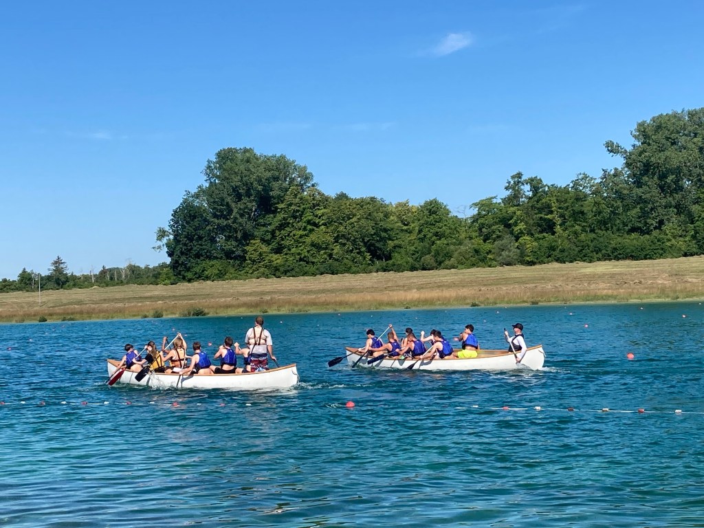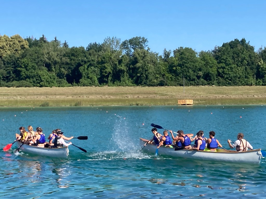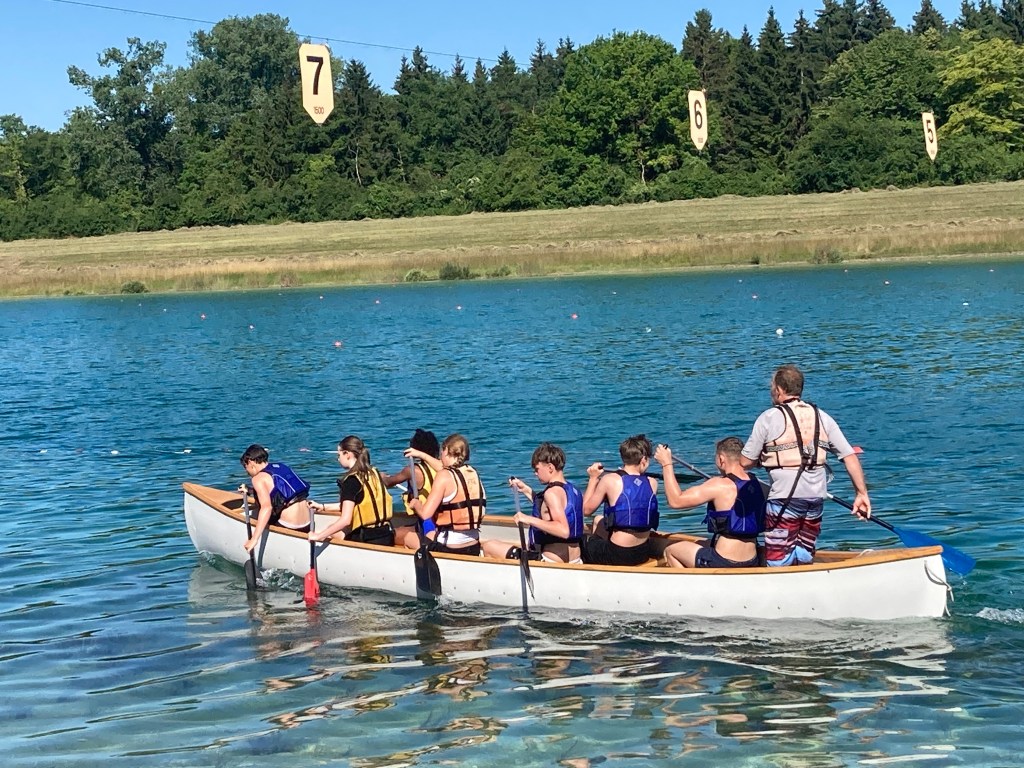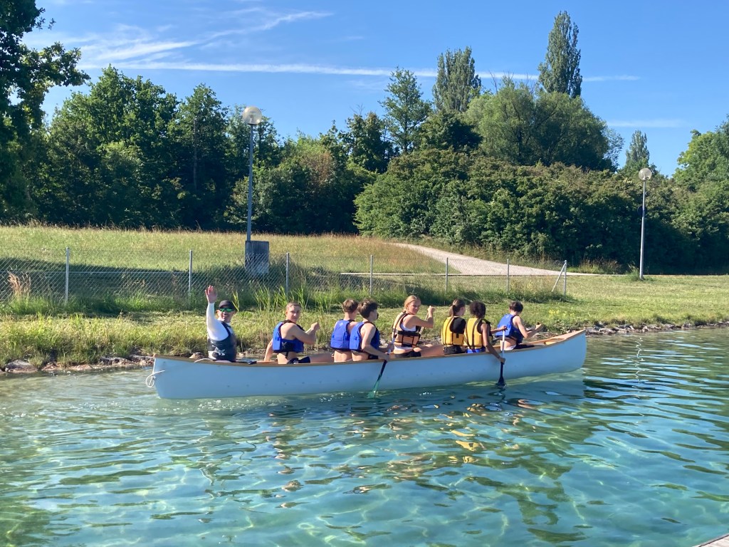 Sogar Herr Fürst ließ sich das Vergnügen nicht entgehen und ging direkt mit auf’s Wasser. Der Tag begann mit einer Fahrt in zwei 10er-Kanadiern, bei der sich die Schülerinnen und Schüler zunächst auf dem Wasser einpaddelten. Danach ging es direkt in spannende Wettrennen über, die nicht selten in wilden Wasserschlachten endeten, sobald sich die Boote zu nahe kamen.