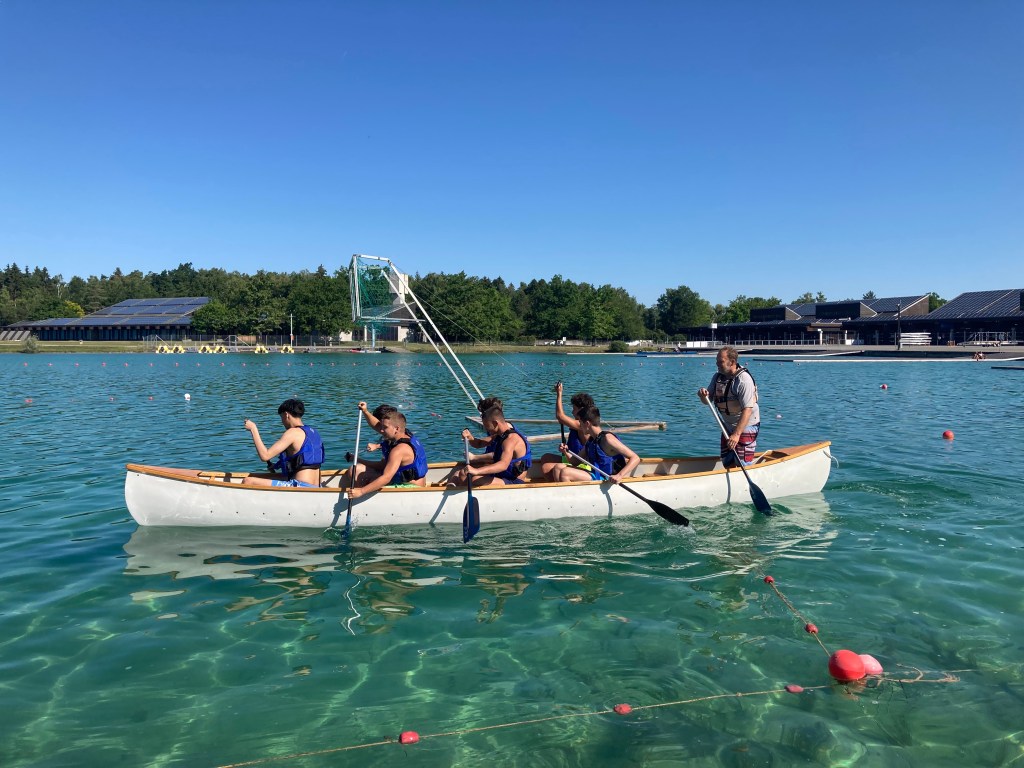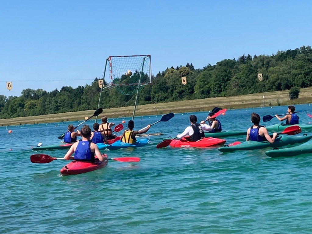 Im Anschluss wurde auf 1er-Kajaks gewechselt. Nach einer kurzen Eingewöhnung und ein paar kleinen Spielen stand das Highlight an: Kajakball! In dieser besonderen Variante durfte mit dem Ball in der Hand nicht gepaddelt, sondern nur gepasst werden. Ziel war es, möglichst viele Körbe zu werfen. Das faire und actionreiche Spiel endete mit einem ausgeglichenen 2:2.