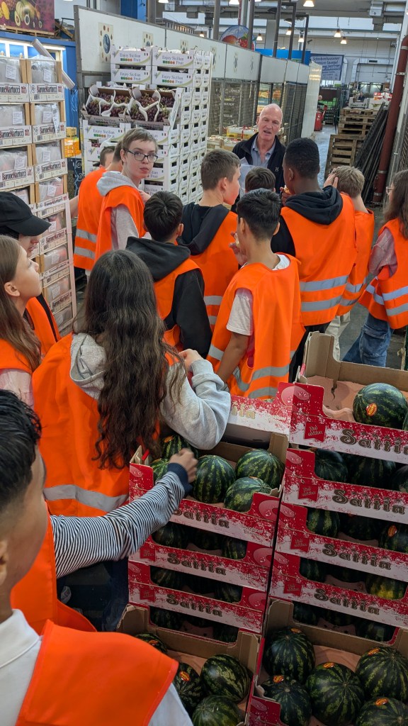 In der großen Halle mit den Obstständen spazierten wir zu mehreren Händlern, die uns Auskunft über ihre wichtigsten Waren gaben. Unser Guide war hervorragend: Fachkundig ging er auf alle Fragen ein, zeigte uns die Highlights des Großmarktes und ermöglichte uns nicht nur spannende Einblicke, sondern auch viele, viele Kostproben. Es war also nicht nur lehrreich, sondern auch richtig gesund. An fast jedem Stand durften unsere Schülerinnen und Schüler probieren und sich von der Frische und Qualität der Produkte überzeugen. Von saftigen Himbeeren und süßen Erdbeeren über knackige Kirschen, erfrischende Melonen, aromatische Nektarinen und Aprikosen – es gab eine Fülle von Geschmäckern und Gerüchen zu entdecken. Dann durften die besten Himbeeren, Erdbeeren, Nektarinen, Marillen, Kirschen, Weintrauben und Wassermelonen ausgiebig probiert werden. Mit vollen Bäuchen machten wir uns zuletzt noch auf den Weg in die Blumenhalle, wo wunderschöne bekannte und exotische Blumen bewundert werden konnten.