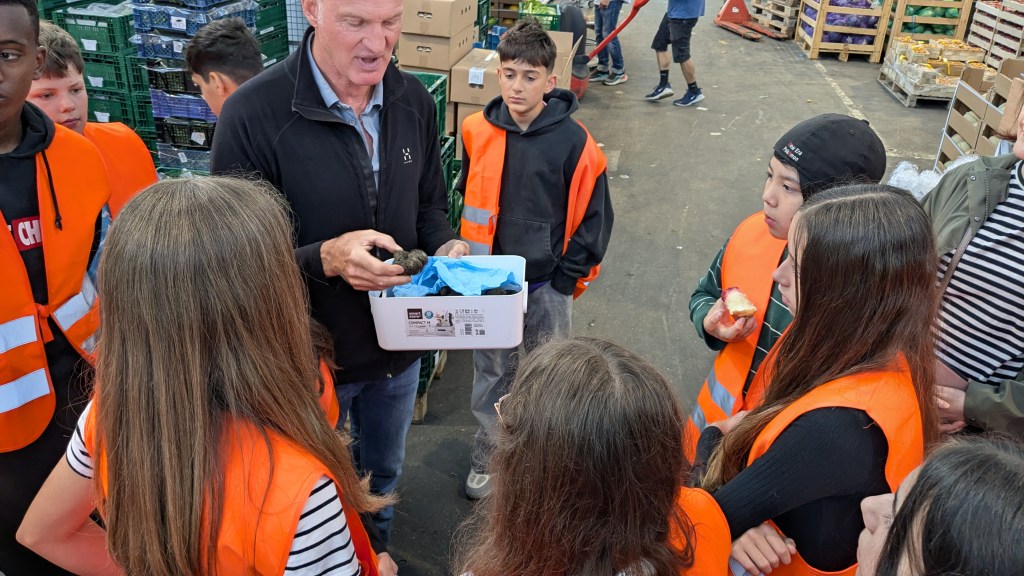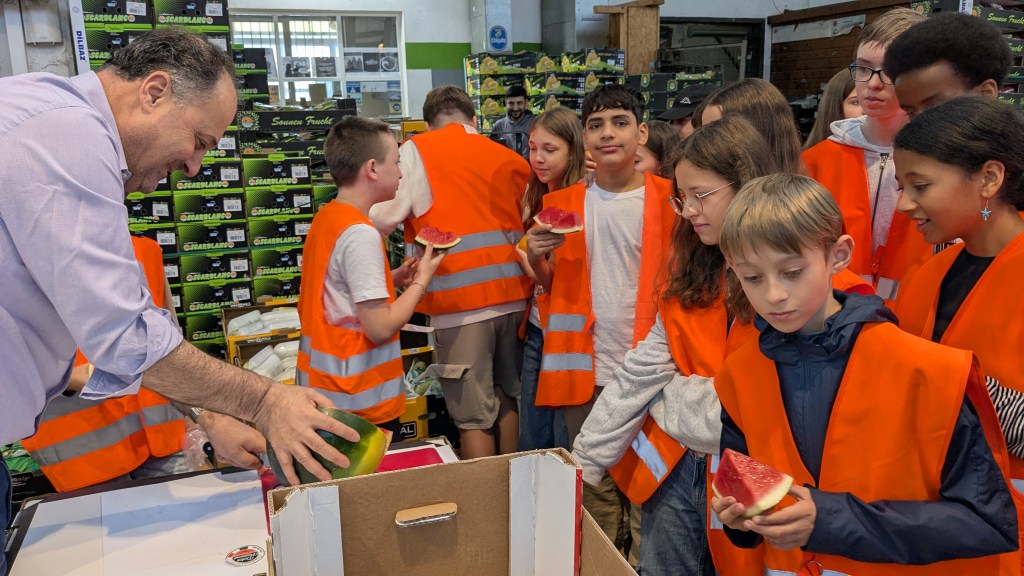 Um 8 Uhr trafen wir uns mit Herrn Gerhard Gessler, der selbst mit Obst und Gemüse handelt, beim Eingang an der Gaststätte Großmarkthalle. Er hat extra für uns einen Rundgang durch die wichtigsten Hallen durchgeführt und dafür gesorgt, dass alle Schülerinnen und Schüler Beeren und Obst in Hülle und Fülle probieren konnten. Außerdem informierte er uns über die Liefer- und Handelsbedingungen der Waren sowie die Geschichte der Münchner Großmarkthalle.