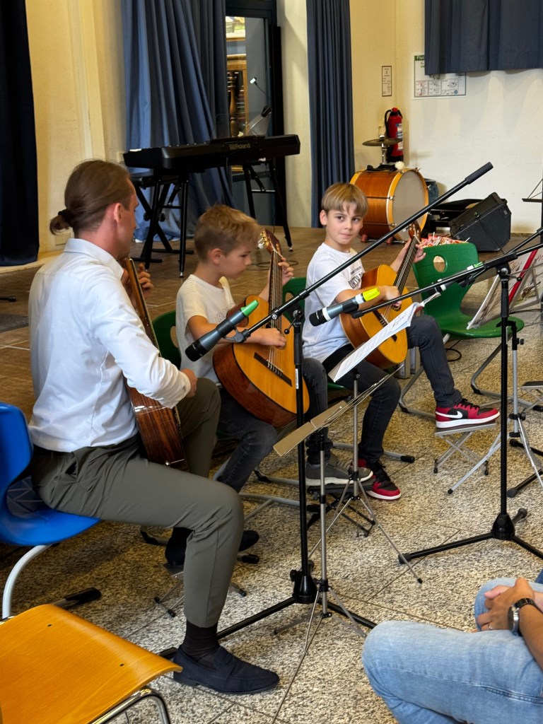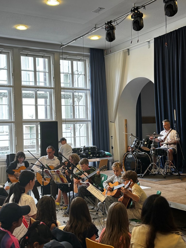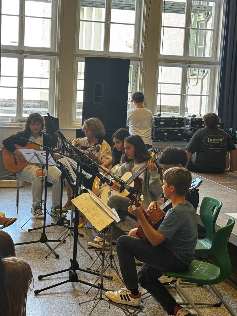 Im Gruppenspiel sorgten die klassischen Gitarren zusammen mit der Schlagzeugbegleitung für einen vollen und rhythmisch abwechslungsreichen Klang, der den gemeinsamen Vortrag besonders lebendig und dynamisch machte.