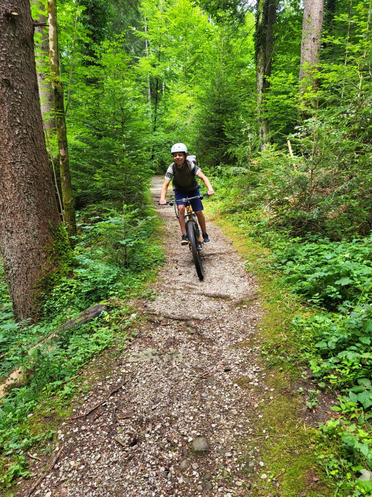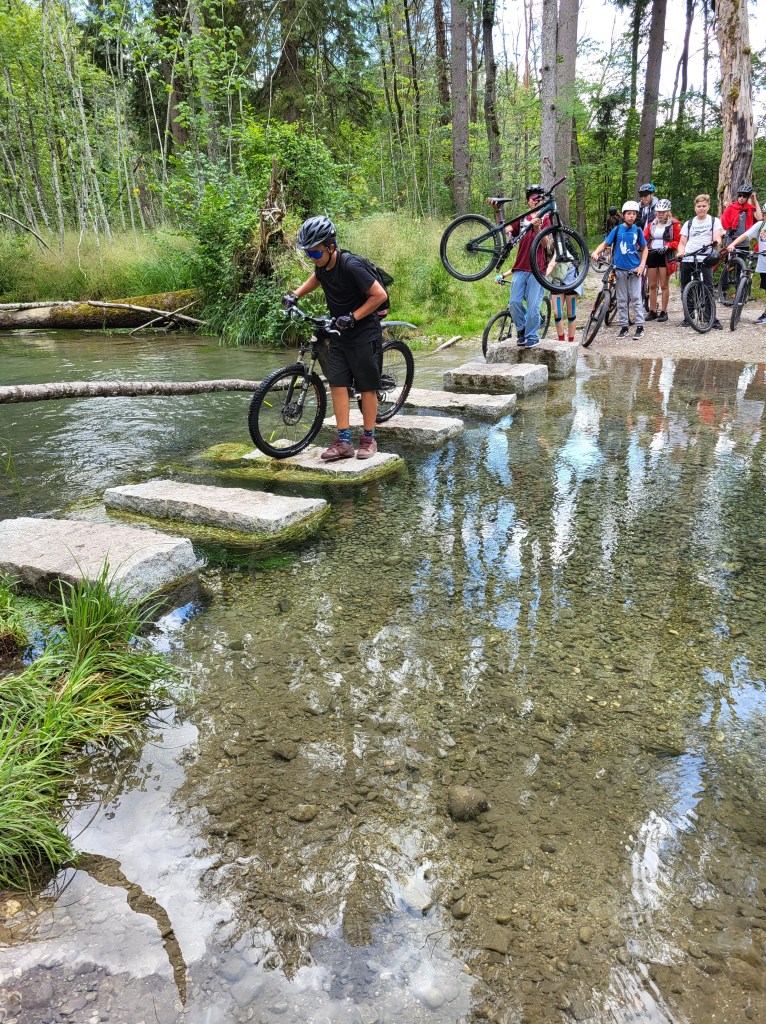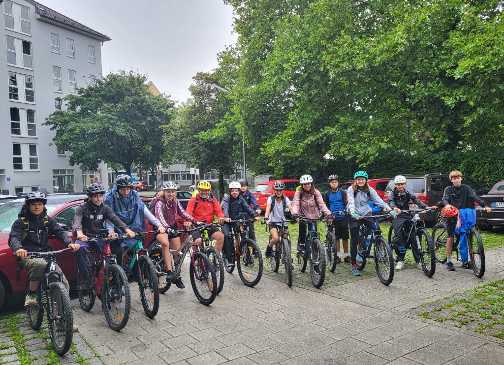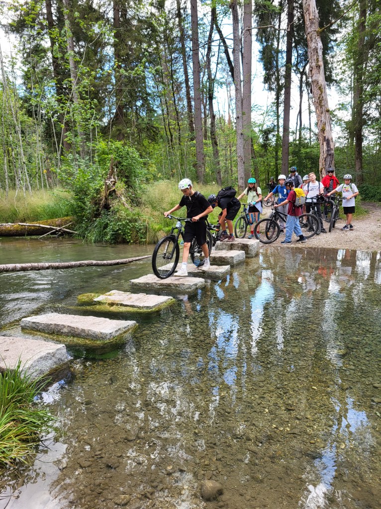 Am letzten Tag ertönte um 7 Uhr der Weckruf. Nach einem Frühstück a la` Frau Milano (****) mussten wir das Camp abbauen. Frau Wegmann sorgte dankenswerterweise für den Abtransport und wir begaben uns auf die längste unserer Touren. Gleich zu Beginn wartete auf die gesamte Gruppe eine Teamaufgabe, bei der die gesamten Räder über 50 Höhenmeter einen sehr steilen, wurzeldurchsetzten und mit Stufen unterbrochenen Steig die Räder nach oben befördern mussten. Durchgeschwitzt und als Team noch näher zusammengerückt fuhren wir die 17 Kilometer in einem Stück bis kurz nach Wolfratshausen durch. Erst nach einer ebenso steilen Schiebepassage vom Hochufer ans Isarufer runter, machten wir unsere erste Pause. Der nächste Abschnitt lässt sich besser als Pfad beschreiben. Gebückt und mit permanentem Kontakt zu allen möglichen Büschen, Bäumen und Pflanzen schlängelte sich unsere „Route“ so durchs Unterholz. Alle waren froh, als sie endlich den Tiefen der Wolfratshauser Isarauen auf einen normalen Waldweg eingebogen. Es war genau bei der Halbzeit der Strecke, als die Mountainbikerinnen und Mountainbiker wieder Geschwindigkeit aufnahmen und das Kloster Schäftlarn passierten. Kurz danach wartete schon die nächste knifflige Stelle, bei der die Räder über einen Bach getragen werden mussten. Ein ständiges Auf und Ab brachte den ein oder anderen ganz schön an die Leistungsgrenze. Jedoch kämpften sich alle 11 Teilnehmerinnen und Teilnehmer der diesjährigen MTB-AG bis zur Ankunft an unserer Schule erfolgreich und stolz auf sich selbst durch. Ein dickes Lob an alle!