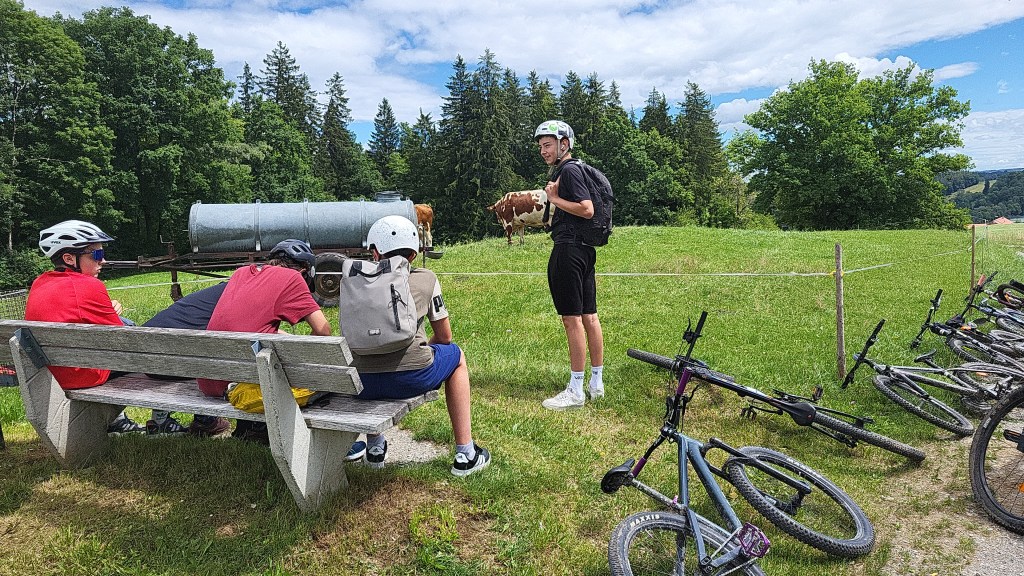 Nach einer nahezu trockenen Nacht wachte die gesamte Mannschafft nach und nach aufgewacht und stärkte sich am fürstlich vorbereiteten Frühstück von Frau Milano. Bei blau-weißem Himmel radelten wir flott Richtung Blomberg. Kurz vor unserem heutigen Etappenziel, der Sommerrodelbahn am Blomberg, trennte sich kurzzeitig unsere Gruppe. Frau Milano, ein weiterer Teilnehmer und Herr Wegmann auf der Suche nach den beiden, mussten ungefähr 50 zusätzliche Höhenmeter zurücklegen. Als die verlorene Gruppe beim vereinbarten Treffpunkt ankam, erwartete sie eine Überraschung. Keine Gruppe weit und breit und das vor einer bevorstehenden Querung einer Kuhweide. Die Auflösung ließ aber nicht lange auf sich warten und der Rest kam lachend aus einer etwas verstecken Einfahrt in der Nähe des Treffpunkts. Nach einer kurzen Pause ging es gemeinsam über die Kuhweide und die letzten Kilometer in Richtung Blomberg. Gut gestärkt nach einem Picknick fuhren wir rasant auf dem Blomberg Blitz mit der Sommerrodelbahn von der Bergstation ins Tal.