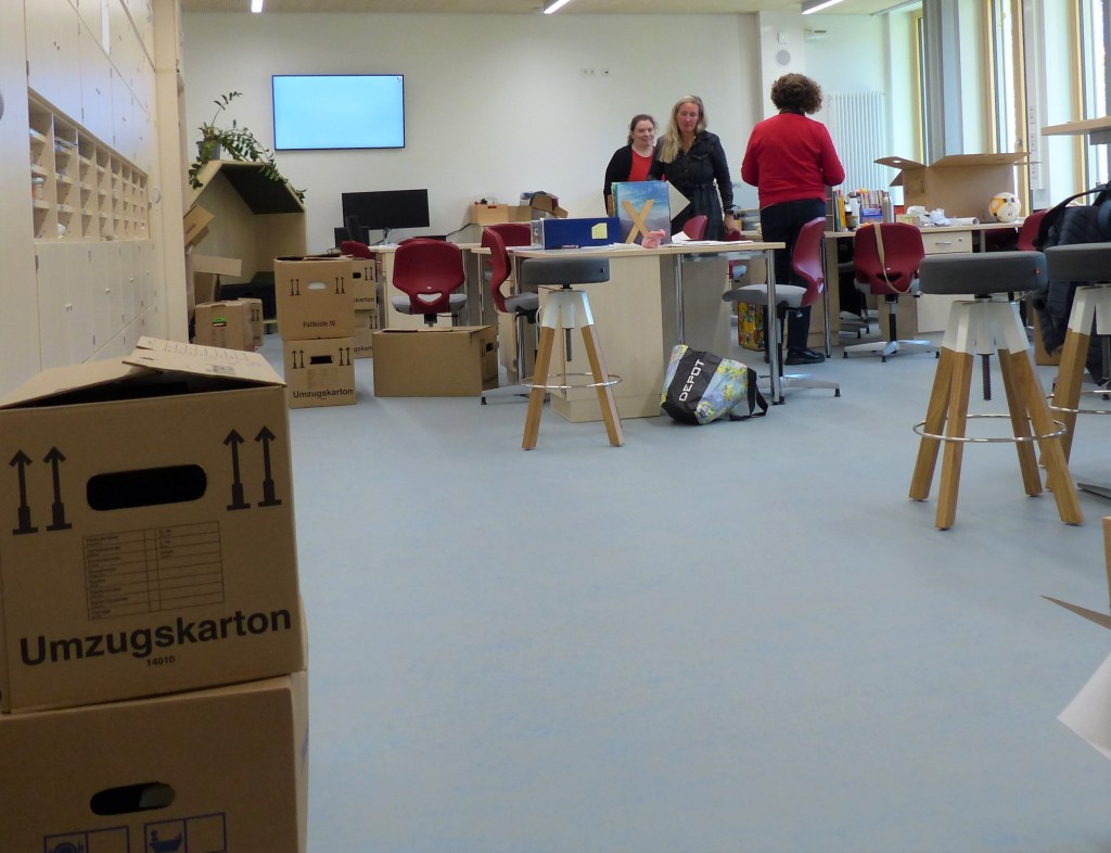 Dank der Koordination des gesamten Umzuges durch Frau Prinzen, Herrn Koller und Frau Winkler hat alles so reibungslos geklappt. Für den technischen Support von der Dokumentenkamera bis hin zum Tabletkoffer sorgten Frau Matzeder, Herr Hilgarth und Herr Königsbauer.