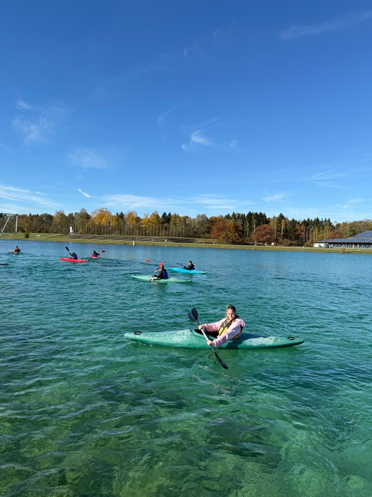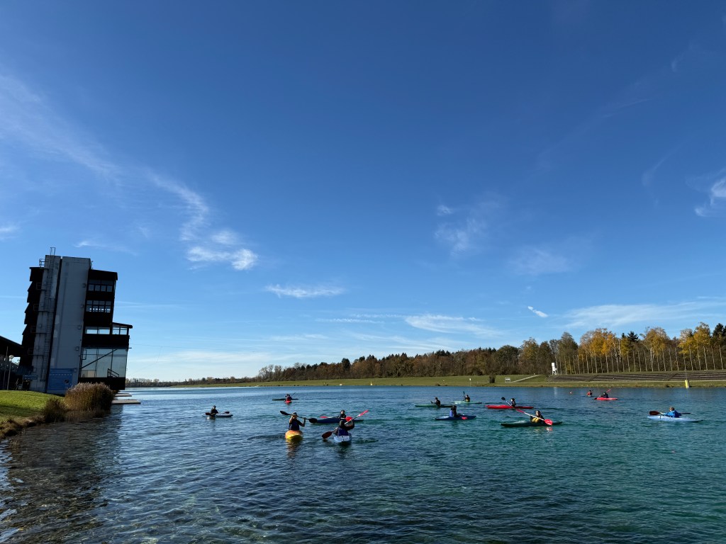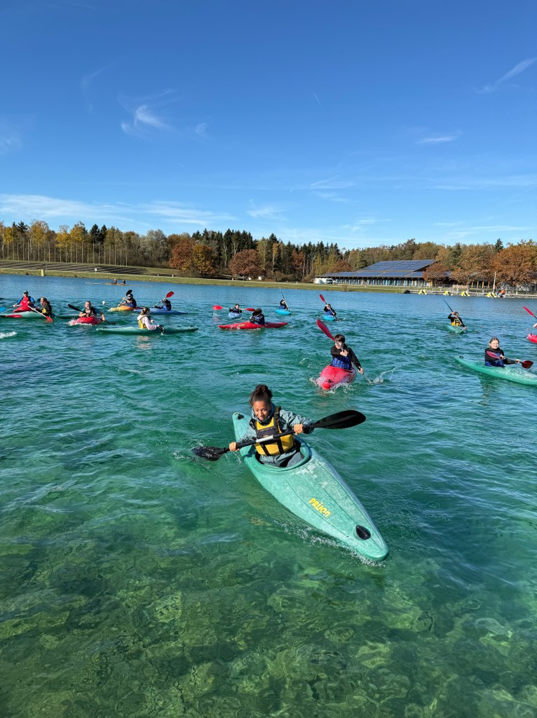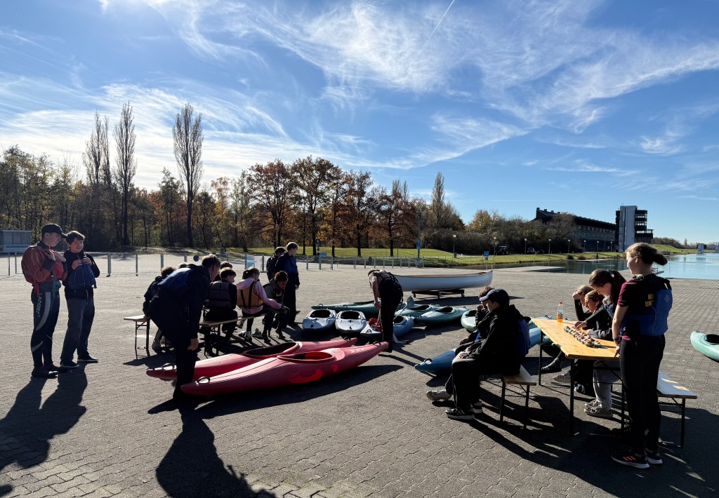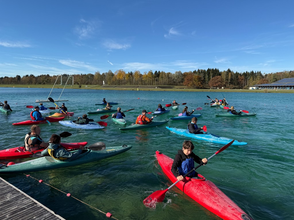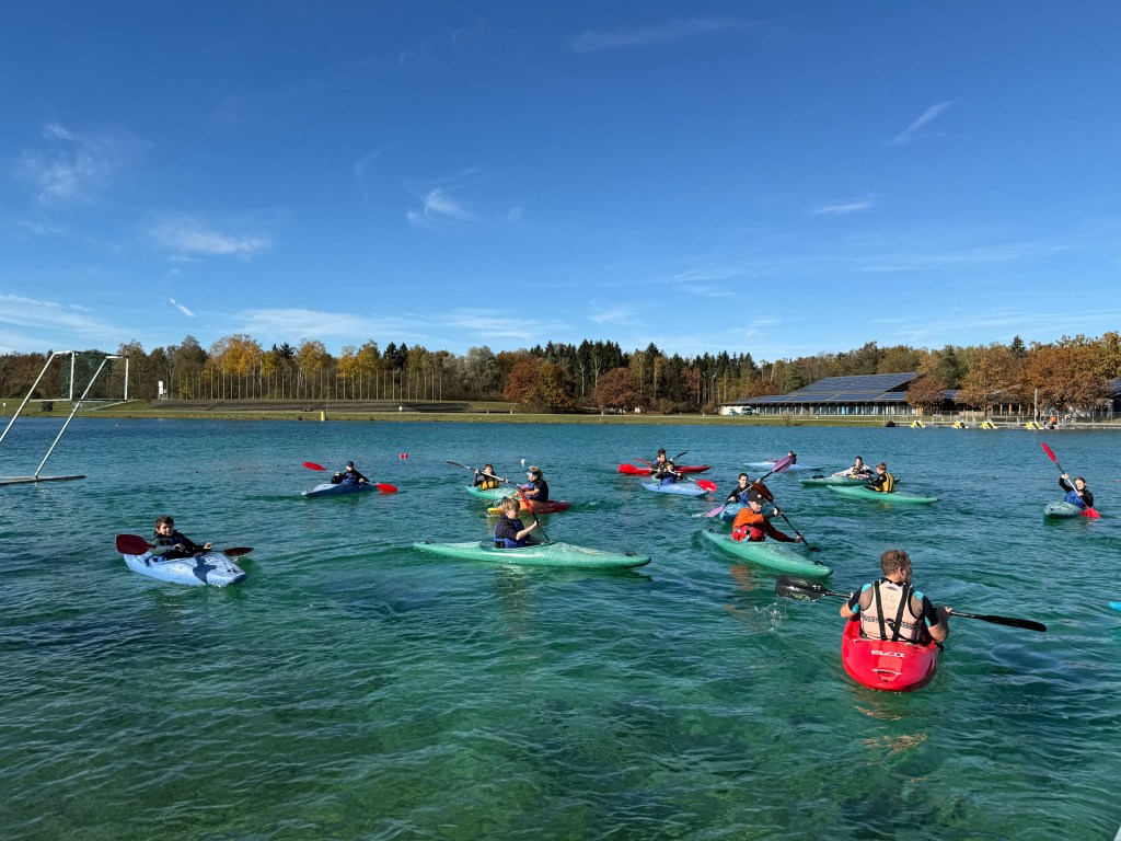 Bei strahlendem Sonnenschein, aber mit bibberkalten Wassertemperaturen, machte sich die Outdoor-AG am Mittwoch, den 29. Oktober 2025, auf den Weg zur Ruderregattastrecke nach Oberschleißheim. Während andere um diese Jahreszeit vielleicht lieber Tee trinken und Kastanien sammeln, wagten sich die mutigen Schülerinnen und Schüler, bestens ausgestattet mit Wechselklamotten und teils sogar Neoprenanzügen, aufs Wasser.