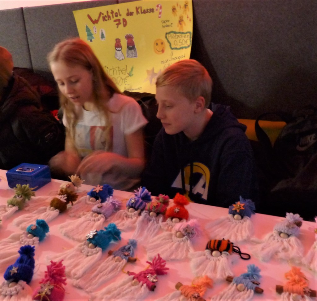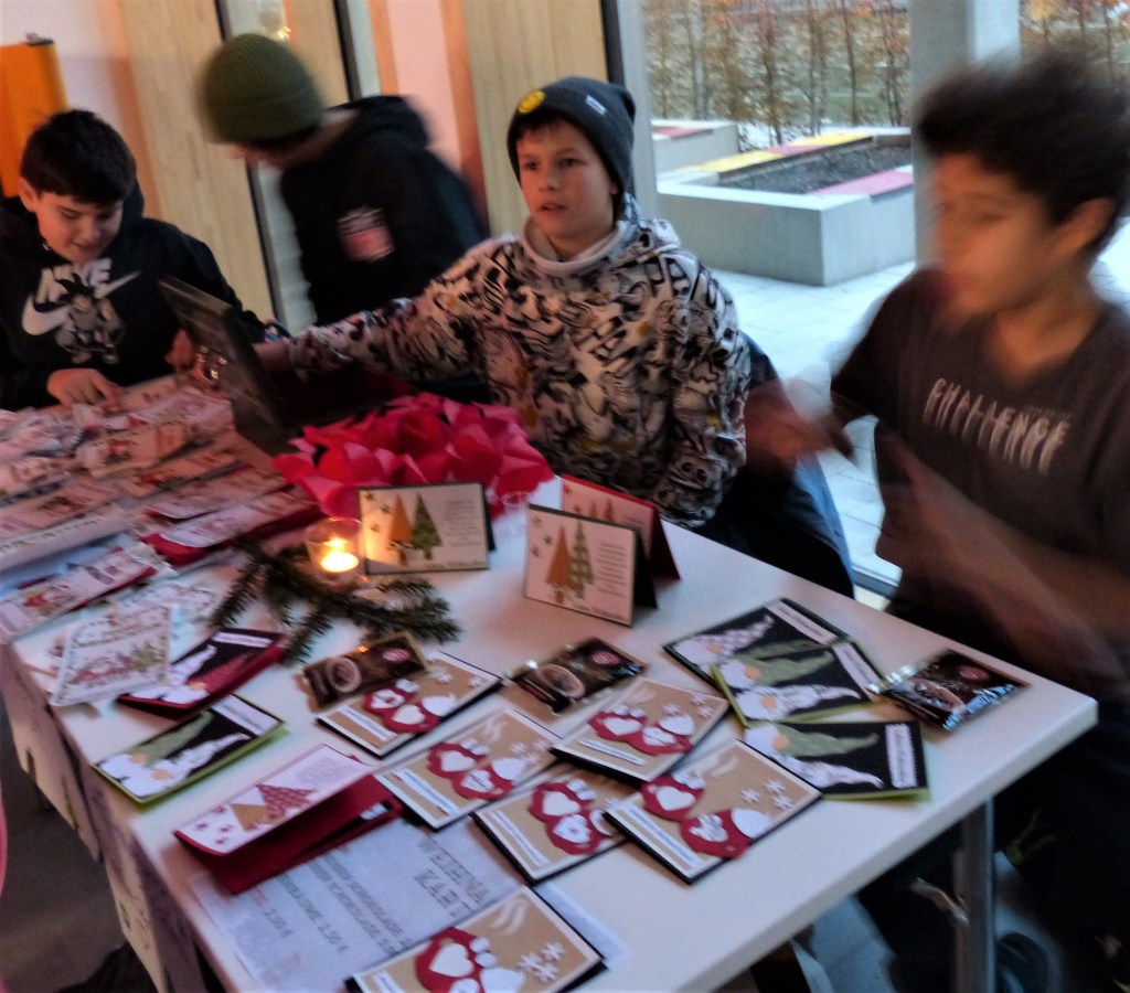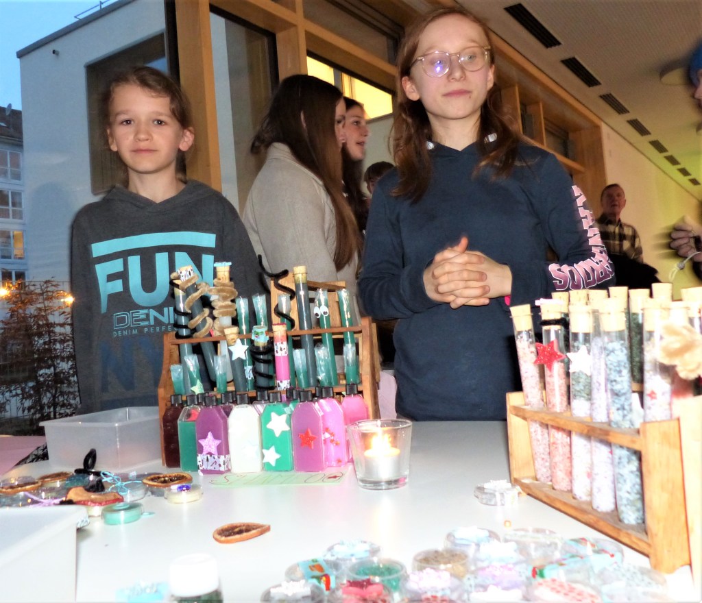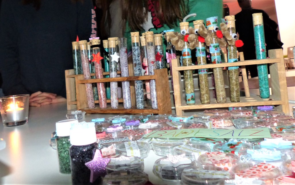 An den Ständen der einzelnen Klassen erwartete die Besucherinnen und Besucher eine vielfältige Auswahl an selbstgemachten Geschenkideen und Dekorationen. Von handgefertigten Weihnachtskarten über kleine Wichtelfiguren bis hin zu duftendem Badesalz – das kreative Engagement der Schülerinnen und Schüler war überall spürbar. Ergänzt wurde das Angebot durch Mitmachaktionen wie Dosenwerfen, einer Fotobox und Henna-Tattoos.
