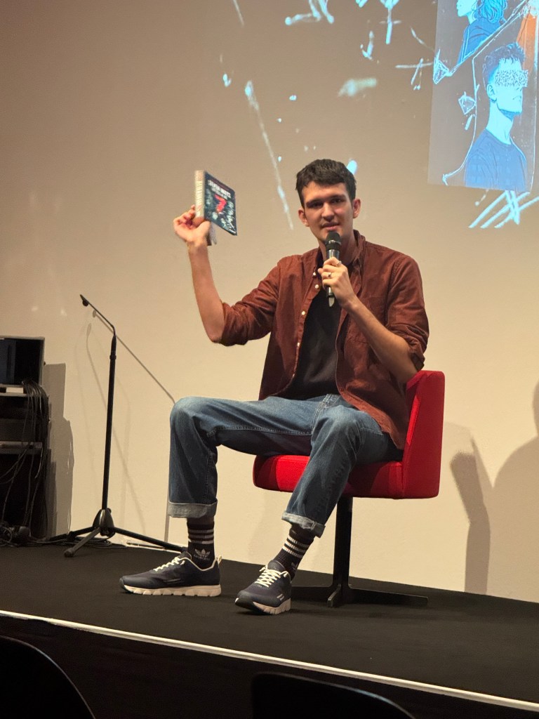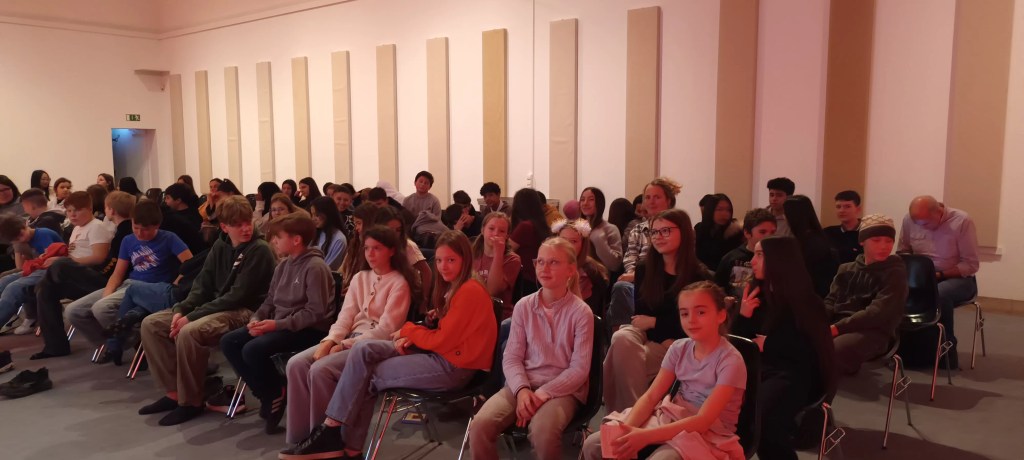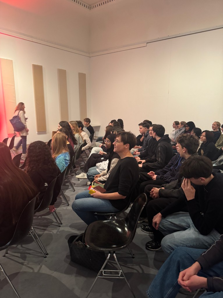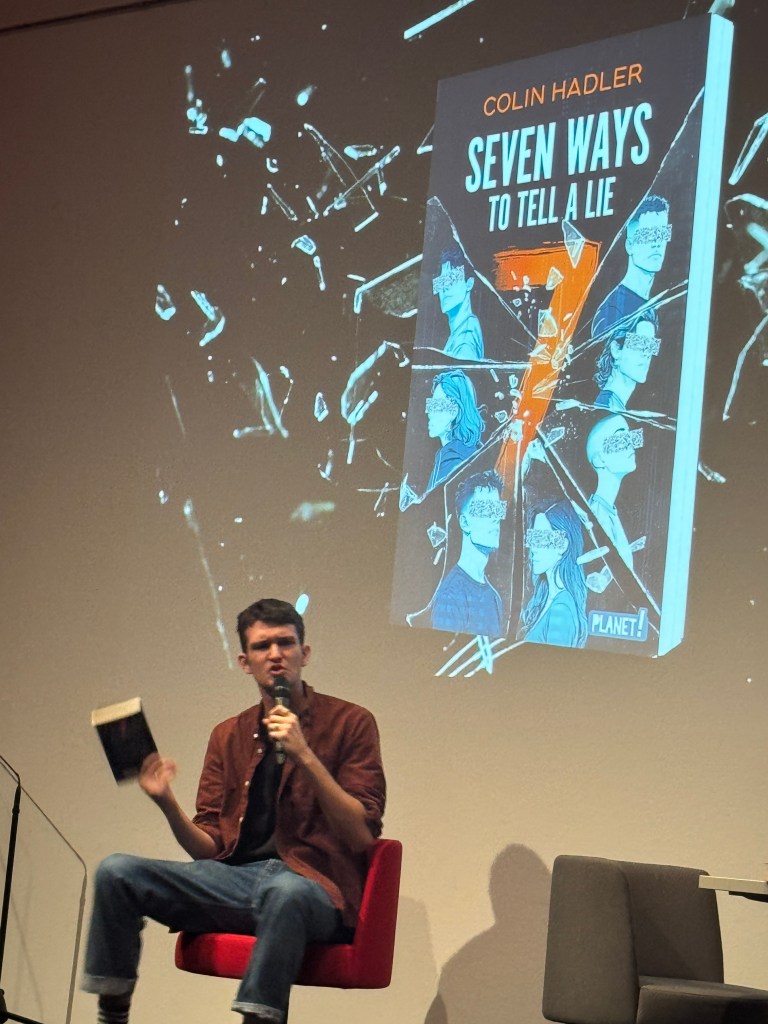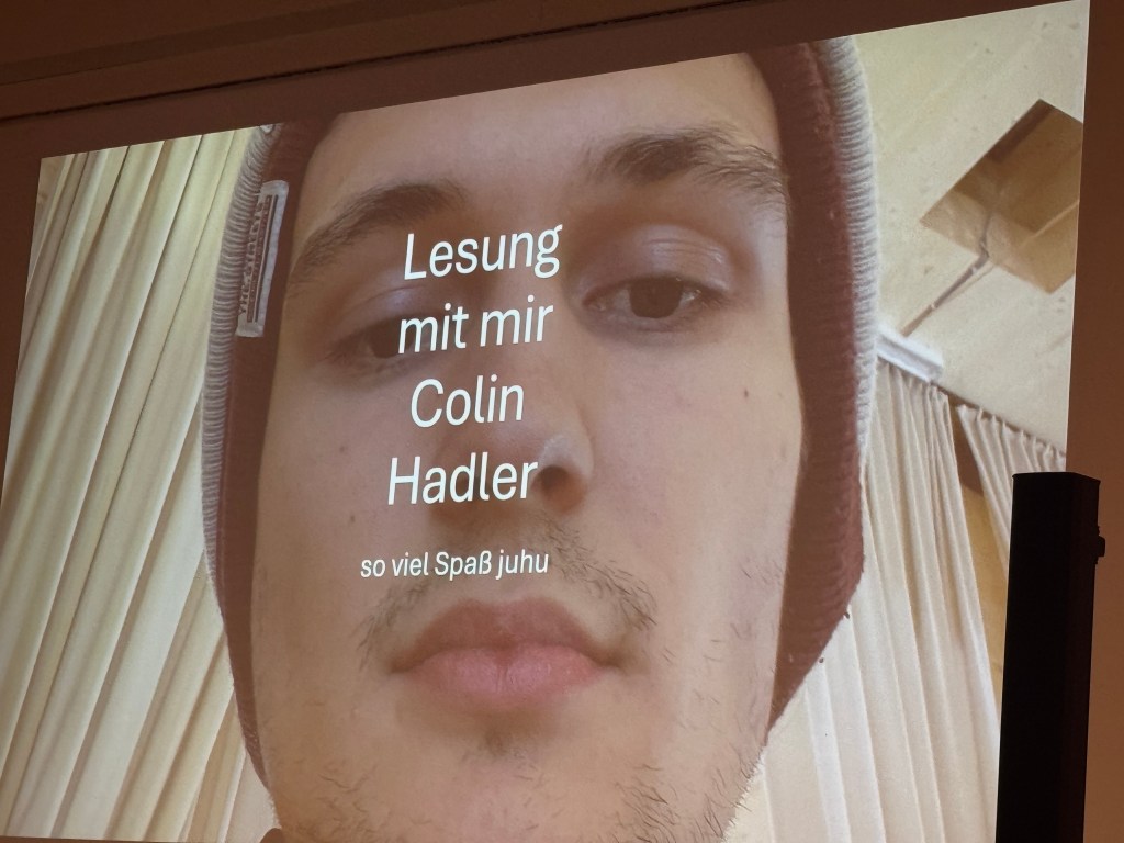 Die Klasse 9c erlebte nicht nur eine Lesung, sondern nahezu ein kleines Kammerspiel (Theater) auf der Bühne im Haus der Kunst. Colin Hadler führte als Schauspieler in seine mysteriöse Geschichte rund um die Geheimnisse seiner Protagonisten ein. Er las nicht, er führte auf. Mit dieser beeindruckenden Performance zum Thema Deepfake zog er die Schüler in seinen Bann. Ein Thriller für jedes Alter.