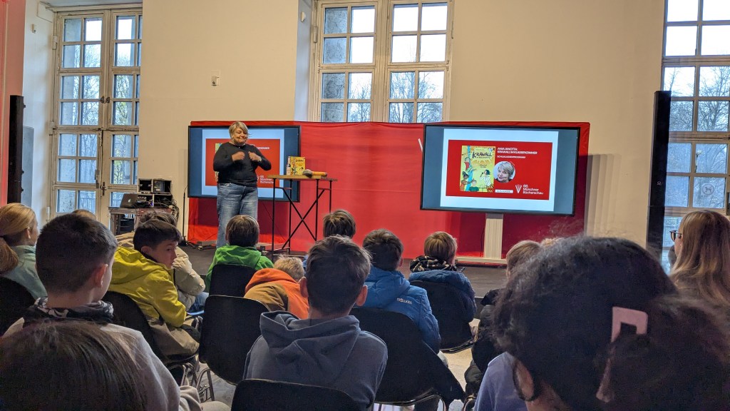 Die Klasse 5b hörte gespannt der Autorin Anja Janotta zu, die den Krawall im Klassenzimmer für die SchülerInnen sehr anschaulich und eindrucksvoll passend zu ihrer Geschichte auf der Bühne demonstrierte. Diese Lesung machte Lust aufs Lesen.