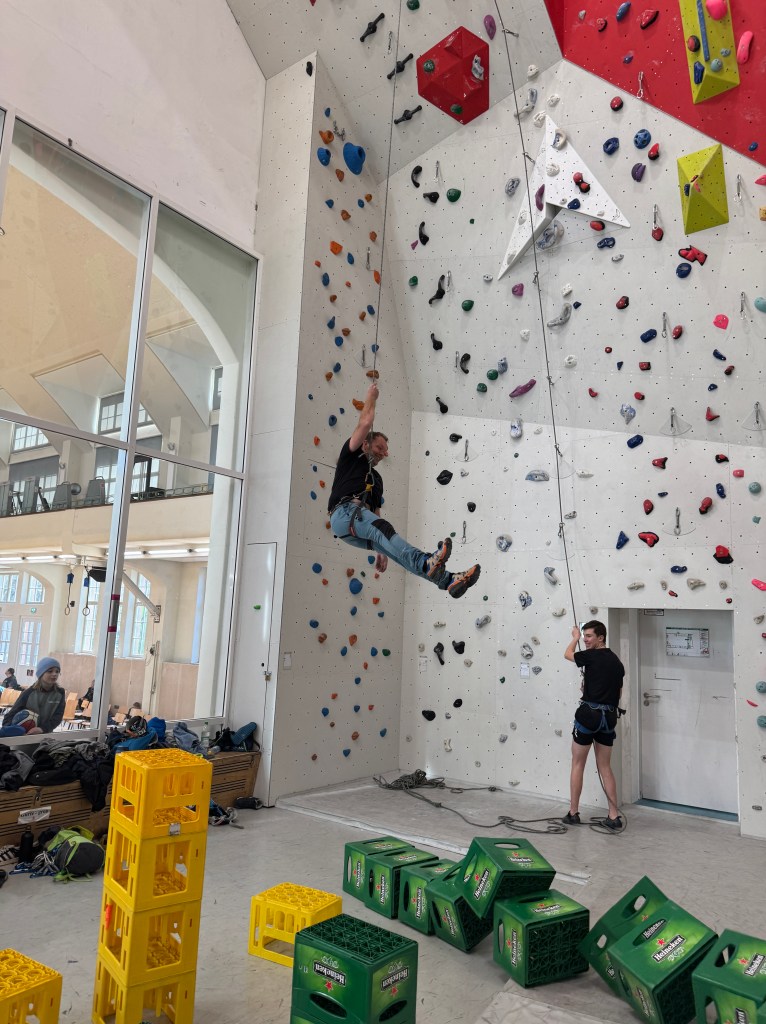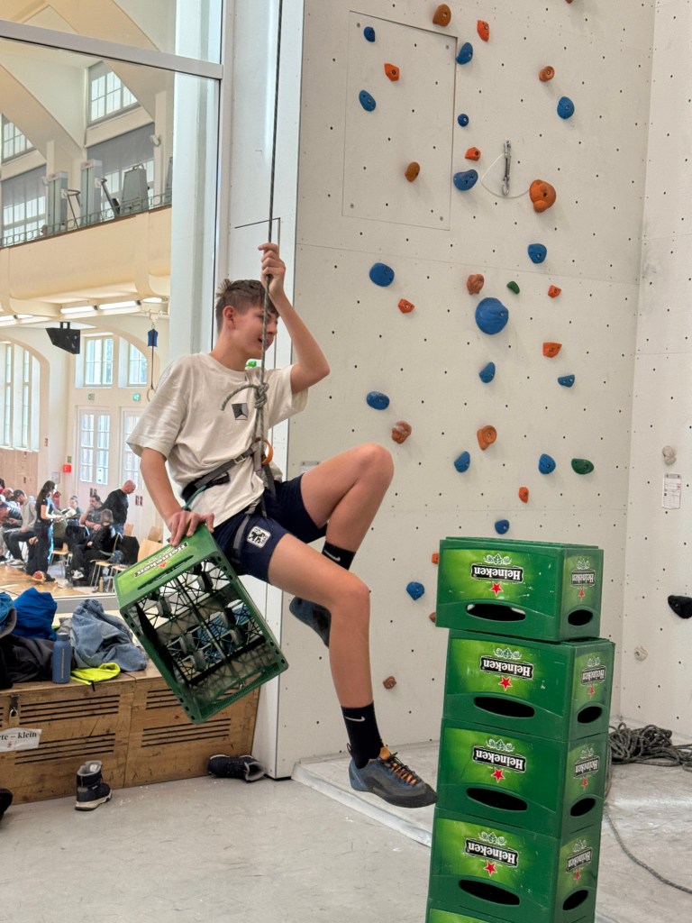 An den Wänden warteten Routen im Schwierigkeitsgrad 5 bis 6+, die mit viel Ehrgeiz, Konzentration und gegenseitiger Unterstützung gemeistert wurden. Ein echtes Highlight war die Gruppenaufgabe: In zwei parallel nebeneinander verlaufenden Routen mussten jeweils zwei Kletterer gemeinsam einen Ball bis zur Decke transportieren – mit einer fiesen Zusatzregel: Der Kletterer mit dem Ball durfte nicht nach oben klettern! Köpfchen, Kommunikation und Vertrauen waren hier gefragt.