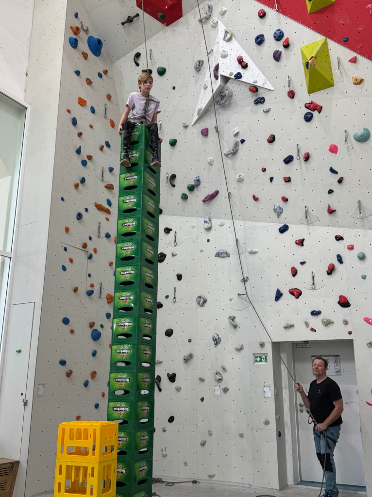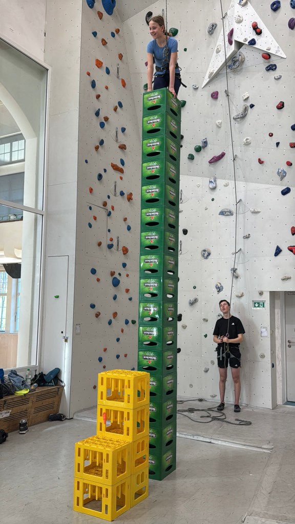 Wer schwer und im Vorstieg klettern möchte, der muss auf alle Fälle das Fallen üben. Aus diesem Grund durfte natürlich auch das Sturztraining nicht fehlen. Zum Abschluss wurde es dann nochmal lustig und die mit Routen eingerichteten Wände wurden verlassen: Kistenklettern! Wer 16 Kisten aufeinanderstapelt und gleichzeitig kletternd erklommen hatte, durfte sich offiziell Kletterkönigin oder Kletterkönig nennen.