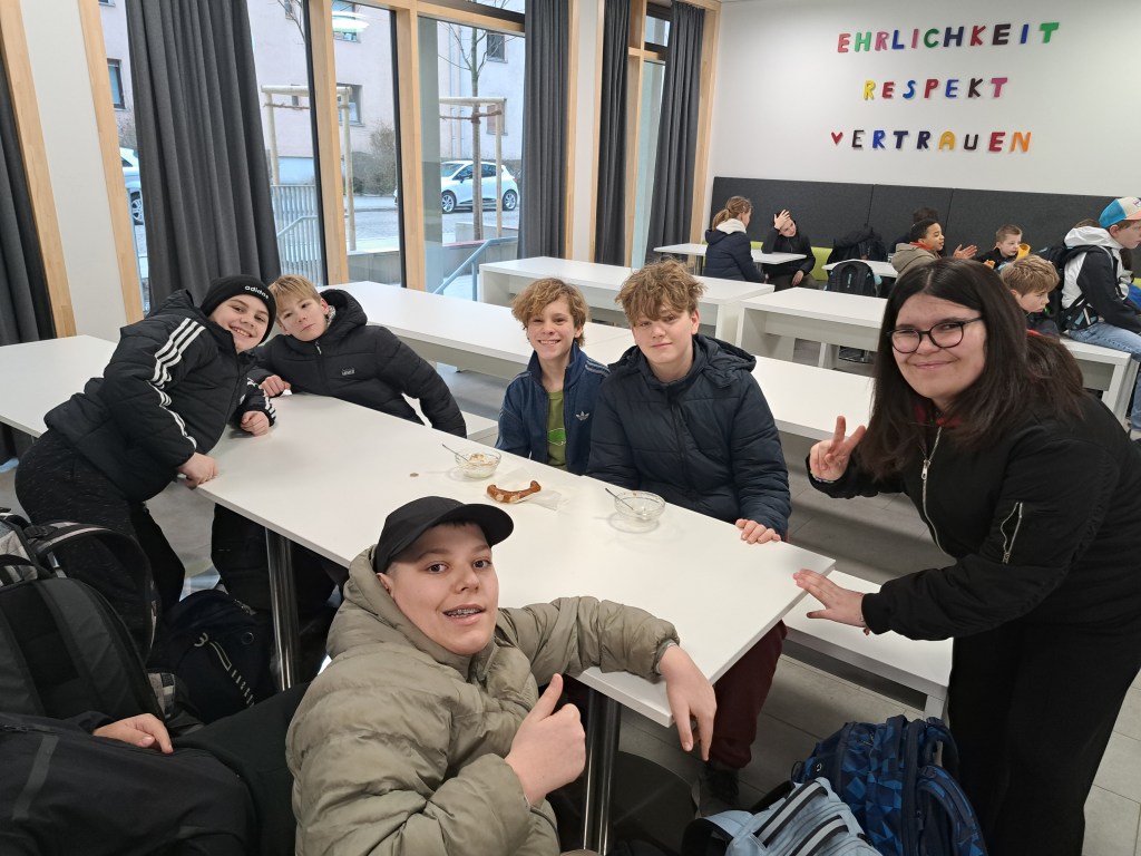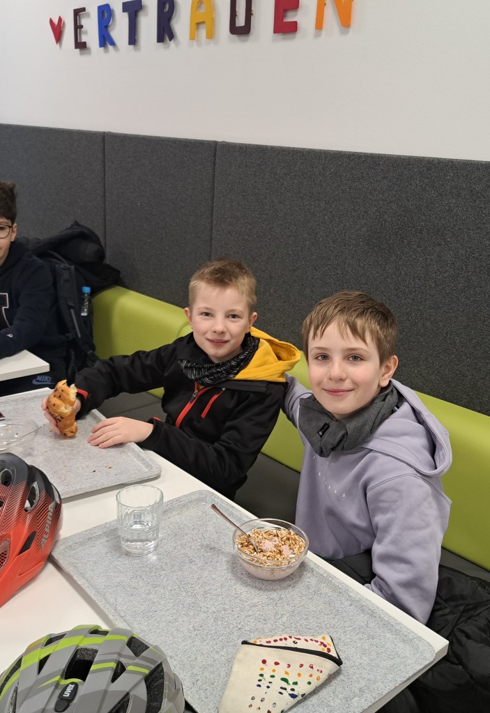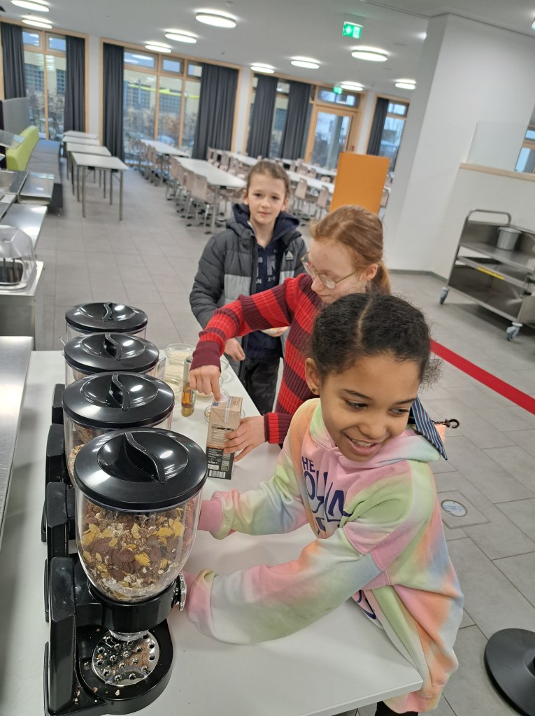 Immer von Montag bis Donnerstag zwischen 7:40 Uhr und 8:00 Uhr konnten sich die Schülerinnen und Schüler der 5. bis 7. Klassen in der Mensa ein Power-Frühstück holen, bevor die erste Stunde startete. Statt hektisch mit leerem Magen in den Unterricht zu rennen, war es ganz entspannt möglich, in der Mensa anzukommen, zu frühstücken und noch kurz mit Freunden zu quatschen.