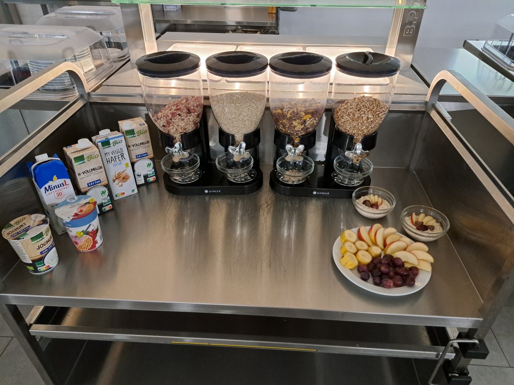 Für das Frühstück musste niemand sein Sparschwein zerschlagen. Eine Schüssel Müsli mit Milch oder Joghurt kostete nur 1,00 Euro, eine Tasse Kakao nur 50 Cent. Wer auf die Klassiker nicht verzichten wollte, kam auch nicht zu kurz: Es gab Brezen für 1,00 Euro und Croissants für 1,50 Euro. Kombiniert werden konnte nach Laune und Hunger .